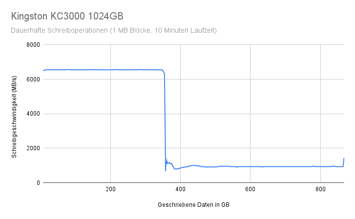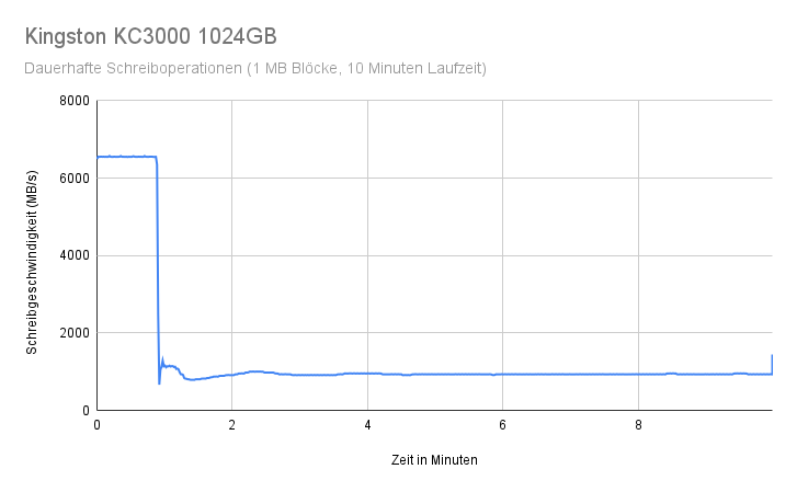 Abschließend wollen wir nun noch den SLC-Schreibcache untersuchen. Moderne SSDs verwenden einen sogenannten Pseudo-SLC-Cache, dabei wird ein Teil der Kapazität im SLC-Modus betrieben, dieser erreicht eine höhere Performance als der restliche Speicher. Wenn die Kapazität des SLC-Cache erschöpft ist, schreibt die SSD direkt in die anderen Speicherzellen, wodurch die Geschwindigkeit einbricht. Die beworbenen Höchstleistungen von SSDs sind praktisch immer die vom SLC unterstützten Transferraten, und die Schreibgeschwindigkeit der SSD kann bei längeren Transfers oder wenn die Kapazität der SSD erschöpft ist, auf einen Bruchteil davon einbrechen. Wir wollen daher untersuchen, wie sich das Schreibverhalten der Kingston KC3000 NVMe SSD unter Dauerbelastung verhält. Dazu belasten wir die SSD über einen Zeitraum von 10 Minuten kontinuierlich mit Schreiboperationen und protokollieren dabei die Schreibgeschwindigkeit.