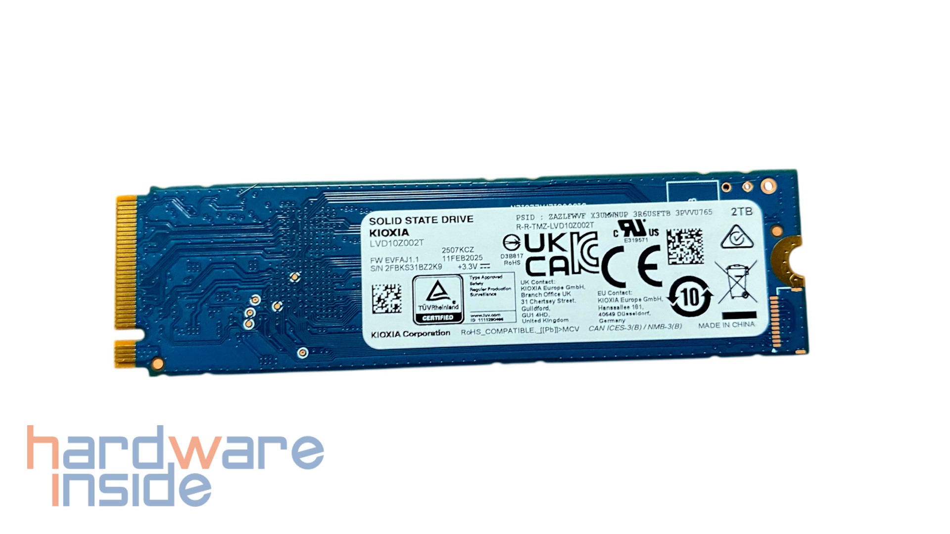 Direkt auf den ersten Blick fällt der großflächige, dunkle Aufkleber ins Auge, der einen Großteil des blauen PCBs verdeckt. Der Aufkleber ist so gefertigt, dass er die Wärmeableitung verbessert und so einen stabilen Betrieb gewährleisten soll. Da es sich bei der G4 PLUS um eine einseitig bestückte M.2-SSD handelt, sind auf der Rückseite auch keine Bauteile vorhanden. Hier ist lediglich ein großer weißer Aufkleber, auf dem unter anderem die Typenbezeichnung, die Seriennummer und die Versorgungsspannung sowie die Kapazität und der UK- und EU-Kontakt aufgedruckt sind. Unter dem Aufkleber befinden sich auf der rechten Seite der PHISON PS5031-E31 PCIe-5.0-Controller und links daneben die beiden BiCS-Flashspeicher. Auf einen zusätzlichen DRAM-Cache muss die EXCERIA G4 PLUS wie bereits erwähnt verzichten, aber durch den kleineren Fertigungsprozess des PHISON-Controllers sollte sich die Leistungsaufnahme verringert haben. Beim PHISON PS5031-E31 handelt es sich um eine etwas langsamere PCIe-5.0-X4-Variante in Bezug auf das E26-High-End-Modell.
