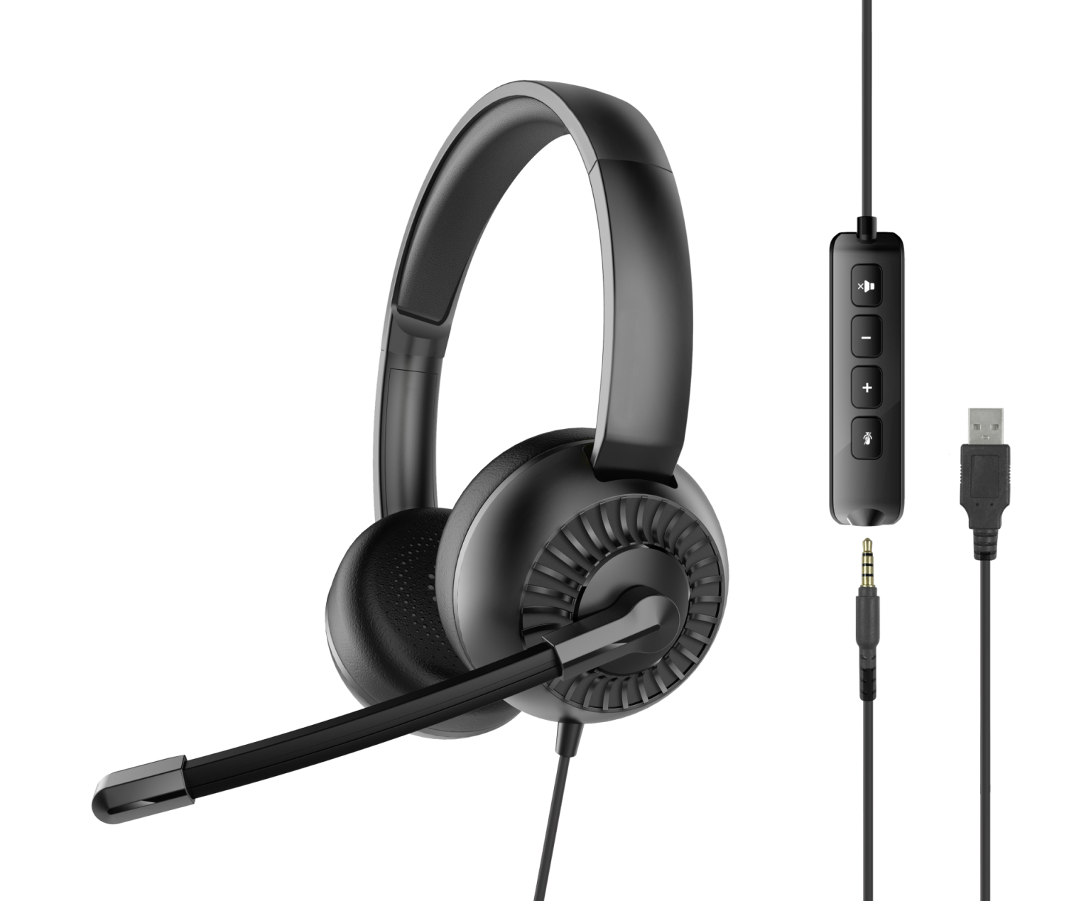 Bei den METIS Stereo-Headsets trifft modernste Technik auf angenehmes Tragegefühl. Mit circa 170 Gramm sind die Kopfhörer wahre Leichtgewichte und sorgen dank stabiler Kopfbügel und weicher Polsterung der Ohrmuschel auch bei langem Gebrauch für bequemes Arbeiten. Natürlicher Stereo-Sound verleiht Telefonaten und Videoanrufen optimale Klangqualität. Mit der integrierten Kabelfernbedienung lassen sich die Lautstärke anpassen und die Stummschaltung aktivieren. Der drehbare Mikrofonarm ist individuell einstellbar und vereinfacht den Arbeitsalltag. Während das METIS Stereo Headset mit praktischem Y-Adapter sowohl über einen 3,5 Millimeter Anschluss als auch mit Geräten mit 2 x 3,5 Millimeter Anschlüssen verbunden werden kann, lässt sich das METIS USB Stereo Headset nicht nur über USB, sondern auch über einen 3,5 Millimeter Anschluss verbinden.