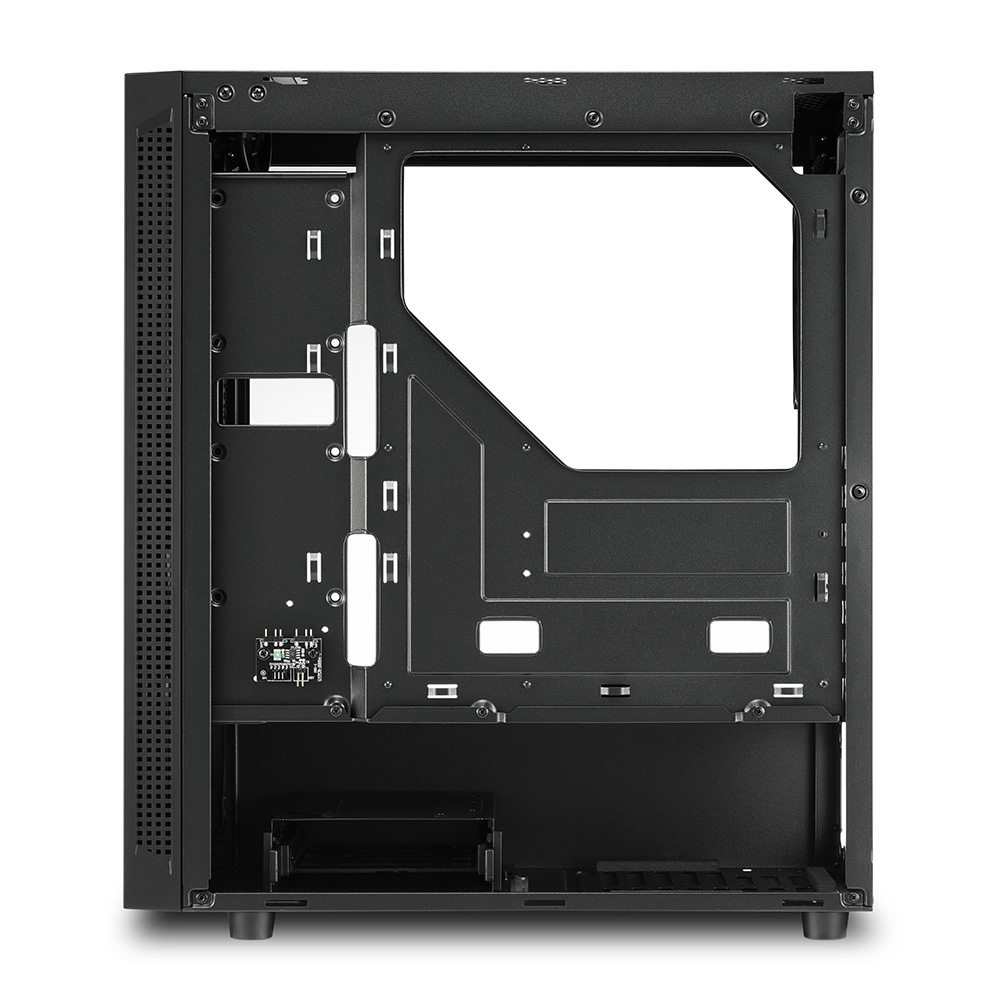 Das RGB Slider verfügt über ein Seitenteil aus gehärtetem Glas, das sich links am Gehäuse befindet. Dadurch ist ein vollständiger Einblick in den Innenraum möglich und die eingebauten Komponenten lassen sich erkennen. Die Oberfläche des Seitenteils bleibt dabei frei von sichtbaren Schrauben, da es im Rahmen eingehängt und am hinteren Ende des Gehäuses befestigt wird.