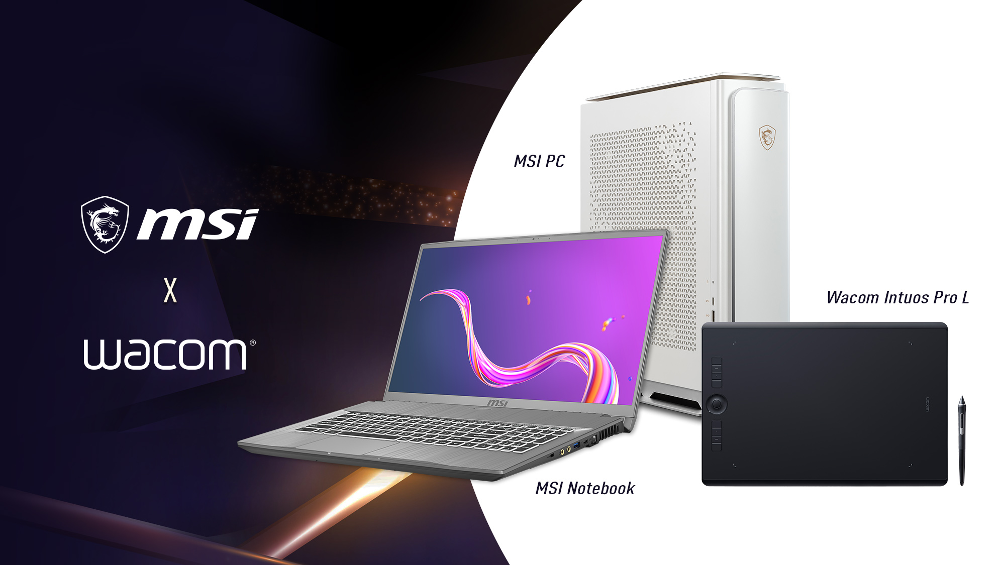 Taipeh/Frankfurt am Main, 17. November 2020 – Zwei Hersteller mit ganz besonderen Produkten für kreative Anwender: Zum einen MSI, einer der weltweit führenden Hersteller von Creator-Hardware; zum anderen WACOM, Marktführer im Bereich Grafiktabletts. Zwei Ereignisse, bei denen beide Hersteller jetzt zusammenarbeiten: Zum einen das WACOM Connected Ink 2020 Event mit zwei Tagen Informationen und Networking rund um die Themen Kreativität, Technik, Kunst und Musik; zum anderen die exklusive Bundle-Aktion, bei der sich ausgewählte Laptops und PCs aus der Creator- und Prestige-Serie von MSI zusammen mit dem Wacom Intuos Pro L Kreativ-Stifttablett zu einem extra spannenden Paketpreis erwerben lassen.
