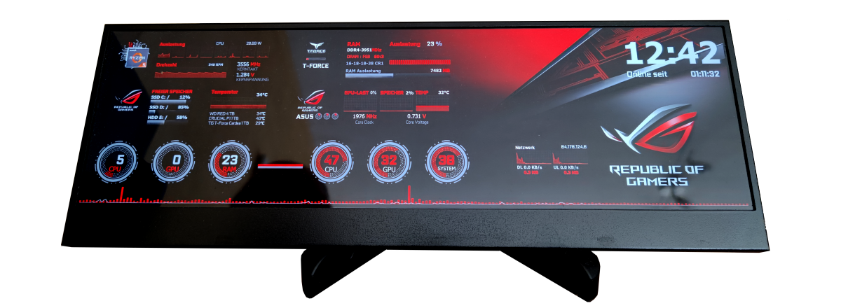 Neben dem Lamptron HM140 befinden sich je ein HDMI auf Mini-HDMI und ein USB zu USB-Typ-C-Kabel. Dazu kommt ein USB-Stick, welcher bereits fertige Vorlagen für die Anzeige der Daten enthält. Wer das Display im Inneren seines Systems verbauen will, findet auch ein Durchführungsblech für einen Slot. Zum Aufstellen gibt es noch einen klappbaren Ständer für das Display