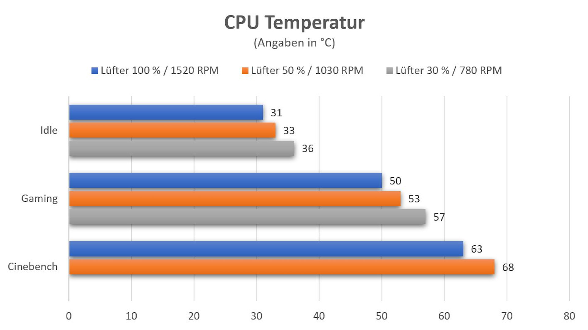 Nachdem wir uns den ST060 genau angesehen haben, kommen wir nun zum Hauptkriterium der Kühlleistung. Um diese zu ermitteln, schauen wir uns die Werte im Idle, beim Gaming und zum Schluss im Lastbetrieb (Cinebench R23, nur bei 50% und 100% RPM), bei einer Umgebungstemperatur von 24 °C an. Dafür fixieren wir die Drehzahl der Lüfter jeweils bei 30 %, 50 % und 100 %. Zusätzlich wurde die Drehzahl der Gehäuselüfter unseres Testsystems ebenfalls bei 1000 RPM fixiert. Jeder Test erfolgt dann über einen Zeitraum von 20 Minuten. Wie auf dem Diagramm zu sehen ist, erreichen wir in keinem der drei Szenarien einen kritischen Wert. Außerdem zeigt sich hier das auch noch genug Luft nach oben ist, um auch leistungshungrigere Prozessoren ausreichend zu kühlen.