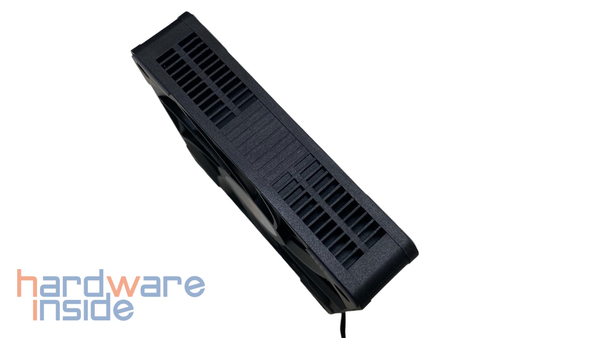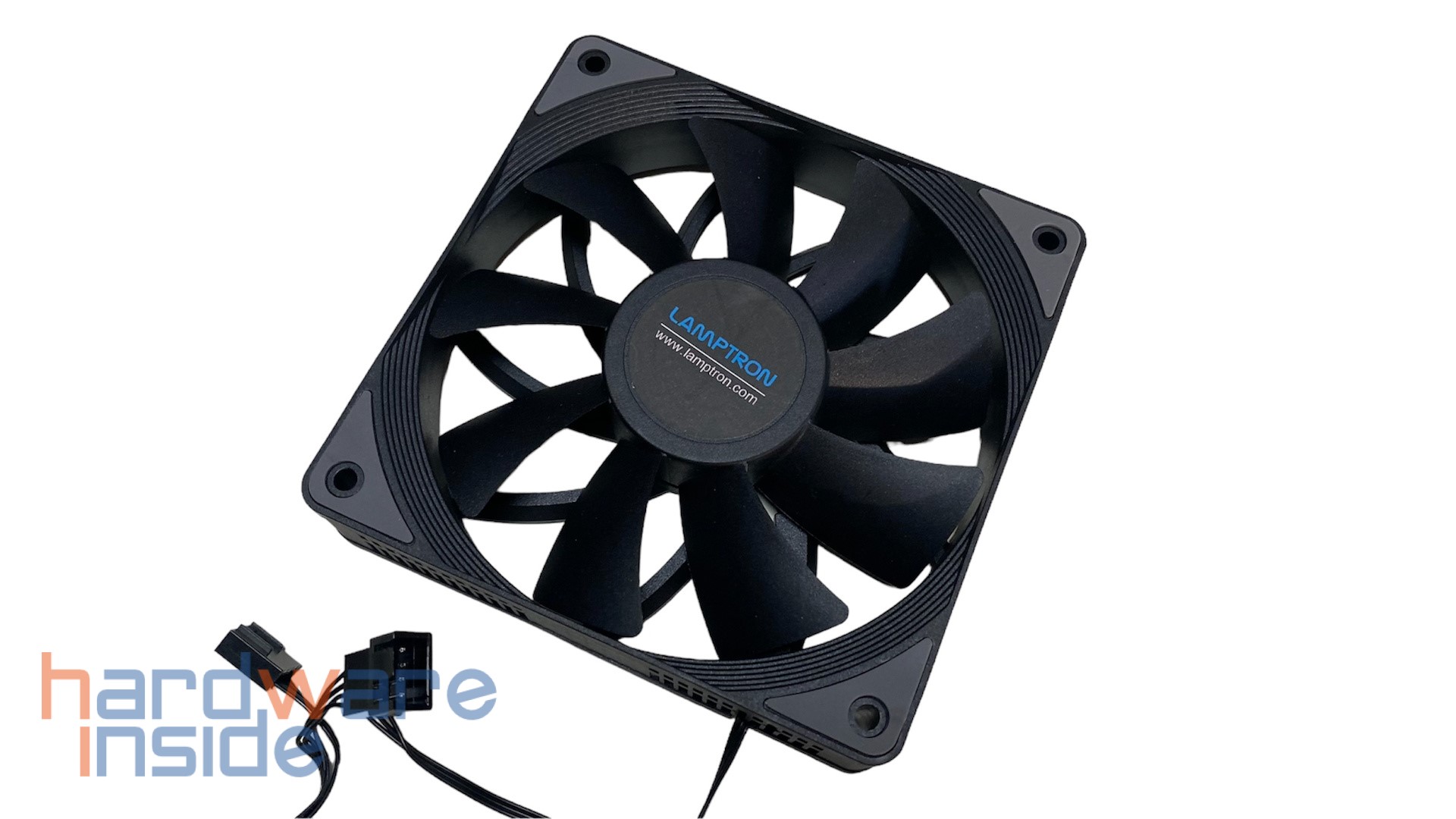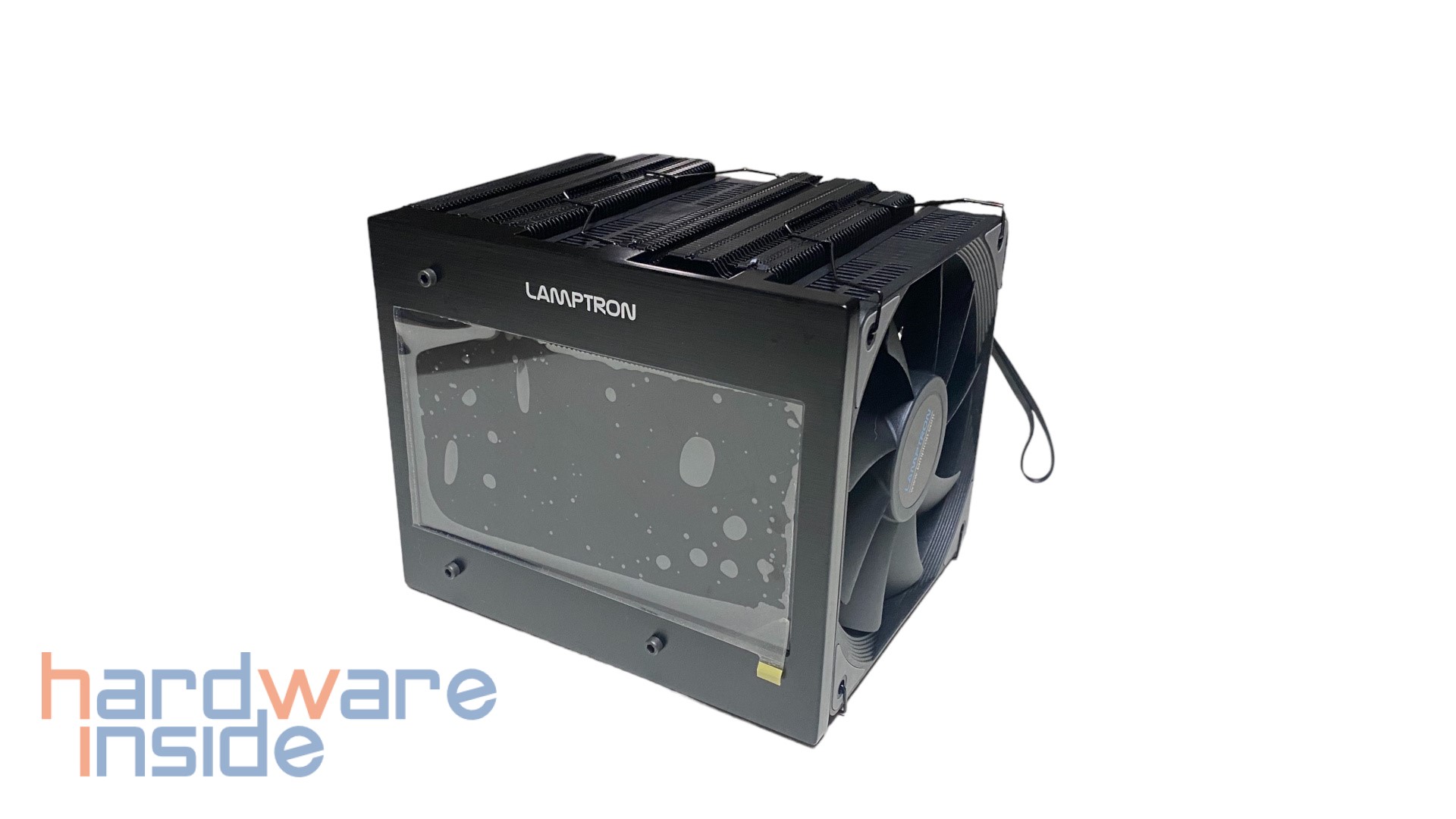 Beim ST060 sorgen zwei 120 mm Lüfter für die Wärmeabfuhr. Ein Lüfter ist direkt an der Front montiert, der zweite sitzt zwischen den beiden Kühltürmen. Die Lüfter sind komplett aus schwarzem Kunststoff gefertigt und zusätzlich an den Kanten mit grauen Antivibrationspads ausgestattet. So sollen Vibrationen im Betrieb verhindert werden. Die neun eng beieinanderstehenden Lüfterblätter sollen die entstehende Wärme zügig abführen. Mittig auf der Lüfternabe ist noch ein schwarzer runder Aufkleber mit dem LAMPTRON-Logo und dem Link zur Webseite angebracht. Das Lüftergehäuse ist an der Seite zusätzlich mit einem Lüftergitter optisch aufgewertet.