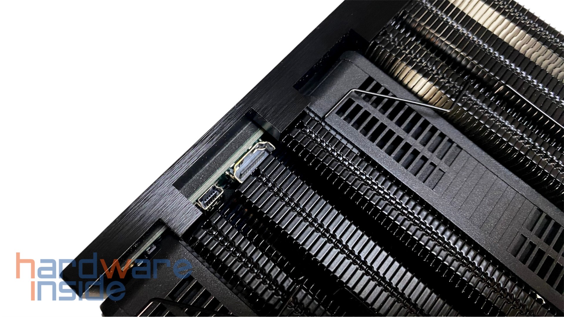 Kommen wir nun zum Hauptfeature vom LAMPTRON ST060, dem integrierten 6 Zoll LCD-Display. Das Display ist ein einem schwarzen Aluminium-Gehäuse mit gebürsteter Optik untergebracht. Gehalten wird das Gehäuse von drei Schrauben, die mit den Towern verschraubt sind. Über dem Display ist ein weißer LAMPTRON-Schriftzug aufgedruckt. Im Auslieferungszustand wird das Display durch eine Folie geschützt. Das Display besitzt eine Auflösung von 1920 x 1080 Pixeln (Full-HD). An der oberen Längsseite sind ein HDMI- und ein Mini-USB-Anschluss untergebracht, diese sind für den Betrieb des Displays notwendig. LAMPTRON liefert die nötigen Kabel im Lieferumfang mit. Die Anschlüsse sind leicht nach hinten versetzt, um ein Herausziehen der Kabel zu verhindern.