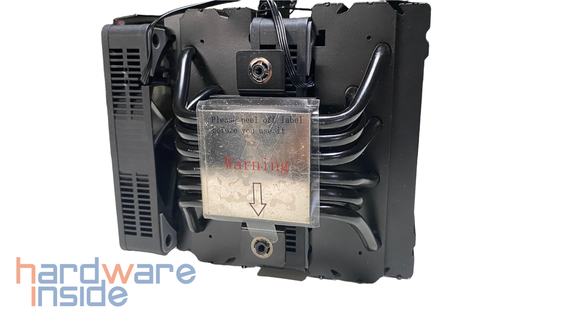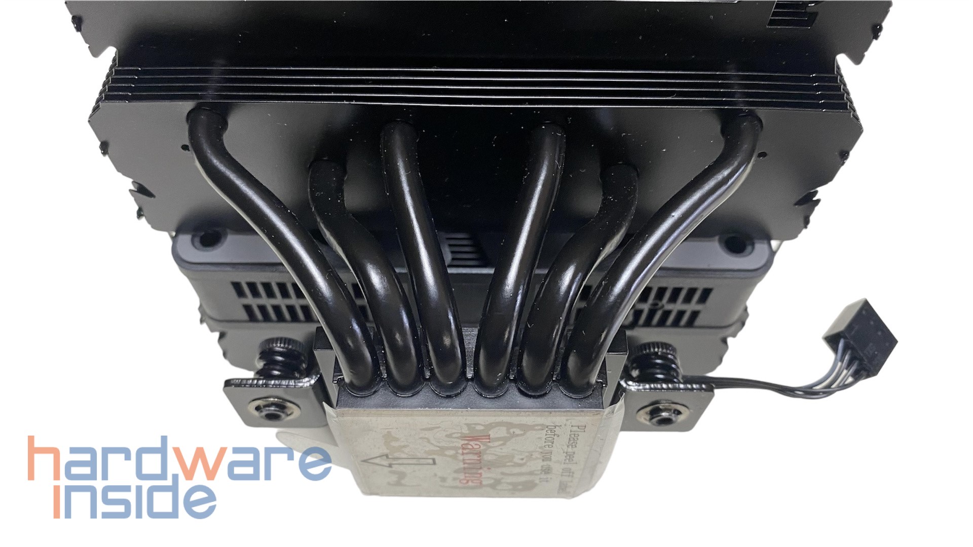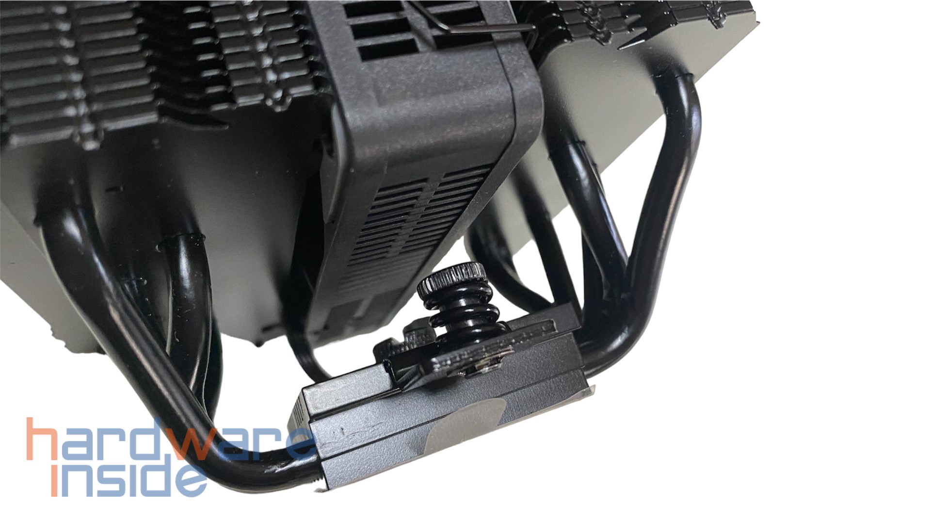 Sechs 6 mm Heatpipes verlaufen nebeneinander durch die vernickelte Kupfer-Bodenplatte und sorgen für eine schnelle Wärmeableitung über die Lamellen der beiden Tower. Auf der Innenseite der Bodenplatte ist die Lüfterhalterung mit einer einzelnen Schraube verschraubt. An den Außenseiten sitzt jeweils eine gefederte Montageschraube mit einem Innengewinde.