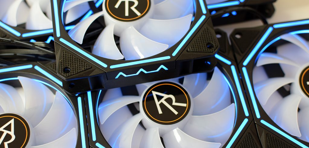 Der Leistungsfaktor ist perfekt. Die AiRazor AR-F120RGB Lüfter sind leise im Betrieb mit 1000 rpm und bilden ein ordentliches Kühl-Ergebnis. Die 3-Pin angesteuerten Lüfter benötigen eine spannungsabhängige Drosselung und können nicht per PWM-Controller gesteuert werden. Die Lautstärke ist bei minimaler Umdrehung von 600 rpm ebenso entspannend wie auf 1000 rpm. Zu sehen ist ein kleiner Unterschied in der Kühlleistung, welche aber als Messtoleranz durchgehen kann. Die Lautstärke überzeugt uns sehr, auch wenn die AiRazor AR-F120RGB Lüfter mit 1250 Umdrehungen wesentlich deutlicher zu hören sind. Das schneidende und rauschende Geräusch ist hochtoniger, als beispielsweise bei einem 140 mm Lüfter mit gleichen Umdrehungen.