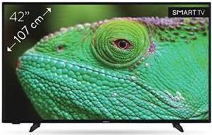 Auf diesem 42 Zoll großen Android-Smart-TV sind Netflix, Disney+, Amazon Prime, Google Play Store, YouTube und Apple TV vorinstalliert. Der Bildschirm verfügt über eine 4K-ULTRA-HD-Auflösung (3.840 x 2.160 Pixel)und unterstützt HDR. Die Bildwiederholfrequenz beträgt 50 Hz. Das Display leistet eine Helligkeit von 300 cd/m² sowie einen Kontrast von 5000:1. Ausgestattet ist der TV mit einem Quad-Core-Prozessor sowie einem Stereo-Lautsprechersystem 2 x 10 W (RMS). Mit Dolby Digital Plus (7.1) unterstützt das Gerät auch Surround-Systeme. Der Medienplayer ist unter anderem mit MP3, WAV, JPG, PNG, MP4, M4A, MOV und AVI kompatibel. Ebenfalls integriert sind DVB-T2-, S2- und C-Empfänger. Zudem besteht Kompatibilität mit Google Assistant. Besonders einfach ist die Wiedergabe oder Aufnahme von Medien über die USB-Verbindung. Zu den zahlreichen Anschlüssen zählen CI/CI+, 3x HDMI, Ethernet, PC-Audioeingang, Kopfhörer, SCART, YPbPr, PC-RGB (VGA) sowie Composite und 2x USB. Ebenso stehen Wi-Fi-2,4- / -5-GHz- und eine klassische Ethernet-Verbindung sowie Bluetooth-5.0 zur Verfügung. Möglich ist natürlich auch die Nutzung einer 75-Ohm-Antenne- und einer Satellitenverbindung. Zu den weiteren Funktionen gehören Schlaftimer, Kindersicherung und Hotelmodus sowie Teletext und Fasttext.