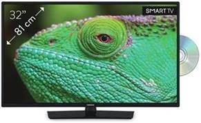 Auf diesem 32 Zoll großen Smart-TV sind Netflix, Amazon Prime, Twitch, YouTube, Deezer und Facebook vorinstalliert. Der Bildschirm verfügt über eine HD-ready Auflösung (1.366 x 768 Pixel) und unterstützt HDR. Die Bildwiederholfrequenz beträgt 50 Hz. Das Display leistet eine Helligkeit von 300 cd/m² sowie einen Kontrast von 3000:1. Ausgestattet ist der TV mit einem Quad-Core-Prozessor sowie einem Stereo-Lautsprechersystem 2 x 6W (RMS). Mit Dolby Digital Plus (7.1) unterstützt das Gerät auch Surround-Systeme. Eine Besonderheit ist der integrierte DVD-Player, der auch zum Abspielen von Musik-CDs genutzt werden kann. Der Medienplayer ist unter anderem mit MP3, WAV, JPG, PNG, MP4, M4A, MOV und AVI kompatibel. Ebenfalls integriert sind DVB-T2-, S2- und C-Empfänger. Besonders einfach ist die Wiedergabe oder Aufnahme von Medien über die USB-Verbindung. Zu den zahlreichen Anschlüssen zählen CI/CI+, 2x HDMI, Ethernet, PC-Audioeingang, Kopfhörer, SCART, YPbPr, PC-RGB (VGA), Composite und USB. Ebenso stehen Wi-Fi-2,4- / -5-GHz- und eine klassische Ethernet-Verbindung sowie Bluetooth-5.0 zur Verfügung. Möglich ist natürlich auch die Nutzung einer 75-Ohm-Antenne- und einer Satellitenverbindung. Zu den weiteren Funktionen gehören Schlaftimer, Kindersicherung und Hotelmodus sowie Teletext und Fasttext.