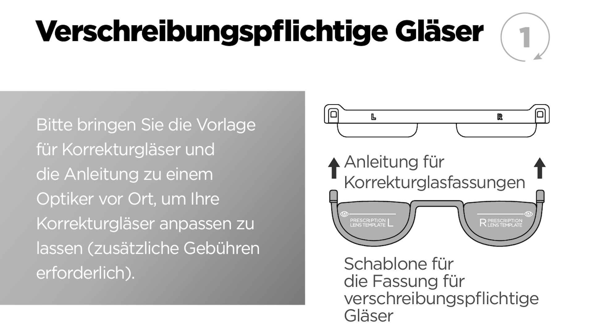 Die Lenovo Legion Glasses eignen sich auch für Brillenträger, allerdings nicht in Verbindung mit der eigenen Brille. Lenovo liefert ihr Gerät mit einer Fassung für Korrekturgläser aus. Mit dieser Fassung und der Anleitung muss man zum Optiker gehen, welcher dann die entsprechenden Gläser anfertigt. Es entstehen somit noch zusätzliche Kosten.