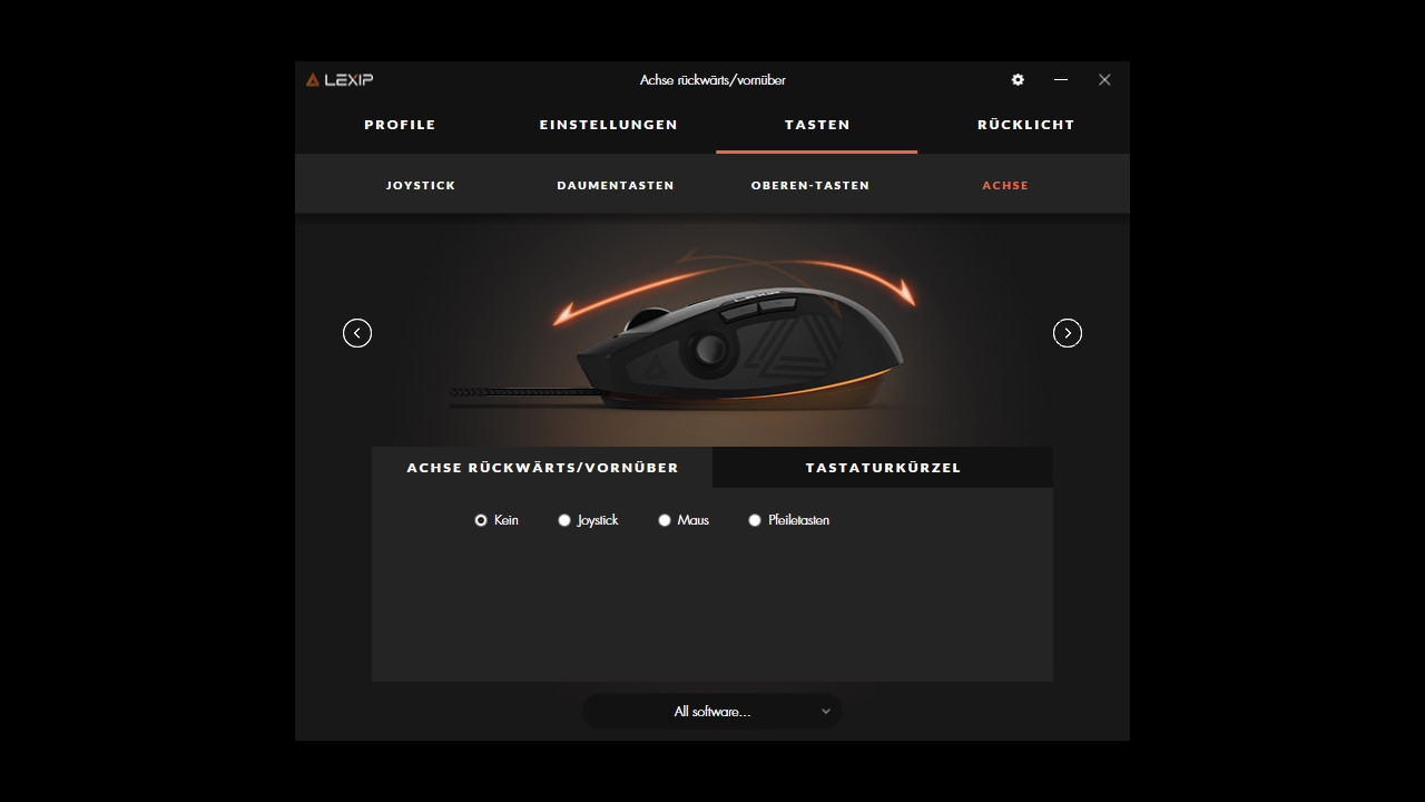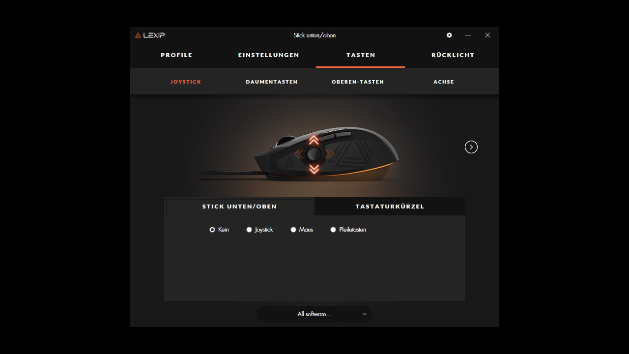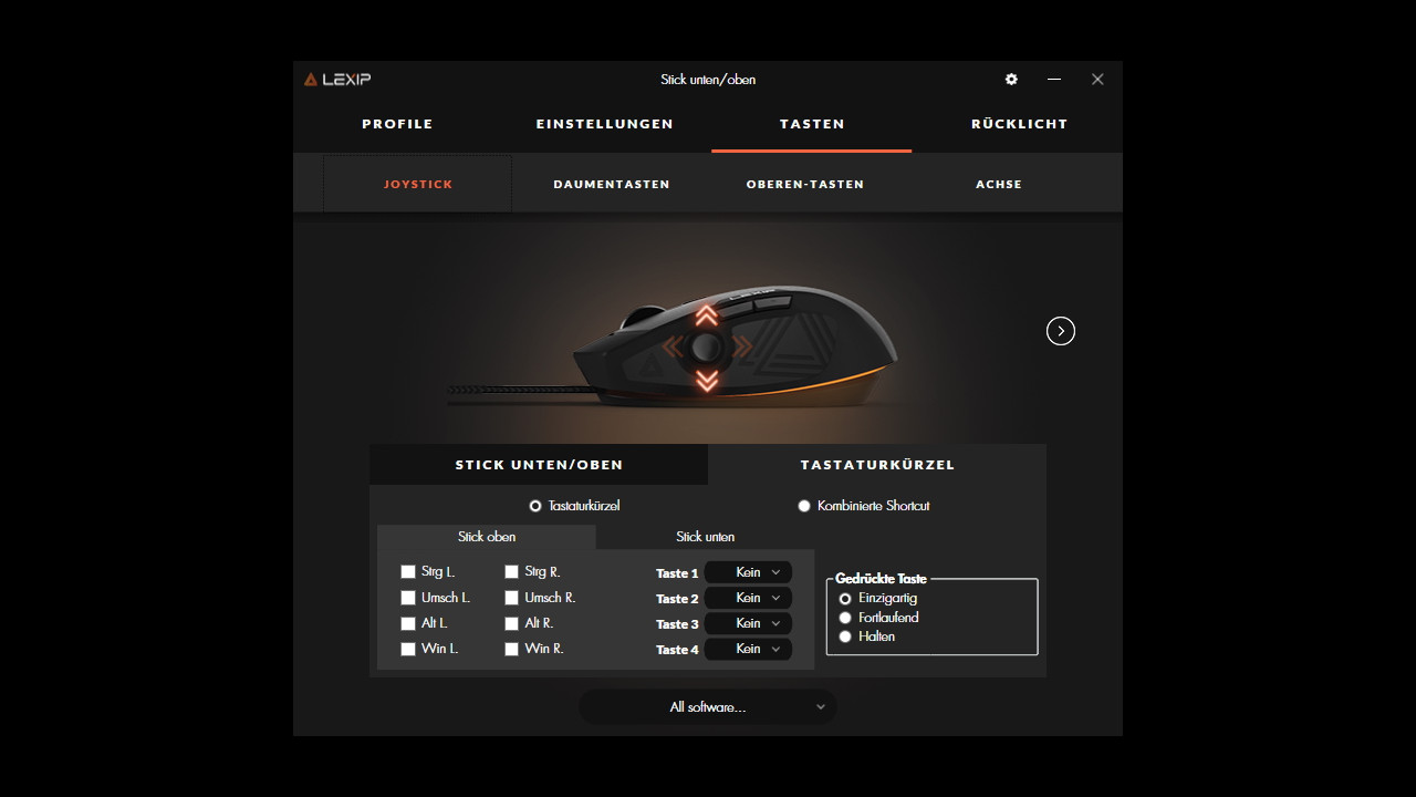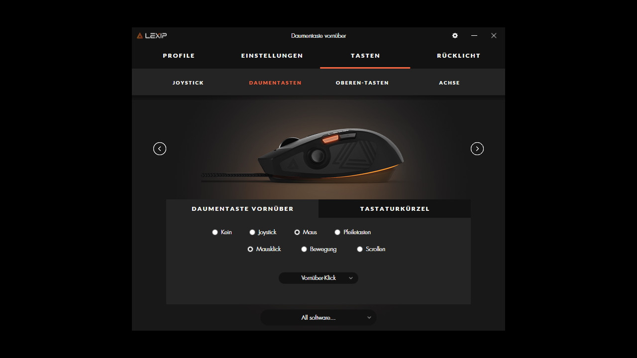 Die Software zur Lexip Pu94 Gaming Maus ist einfach und intuitiv gestaltet. Zum Anfang lassen sich Profile einrichten. Es können aber auch bereits vorgefertigte Profile für gängige Programme und beliebte Spiele direkt von der Herstellerseite geladen werden. Im Grunde bietet die Software alle wichtigen Einstellungen. Jede Taste lässt sich nach Belieben mit einer Funktion oder mit Makros belegen, dasselbe gilt auch für den Mini-Joystick und der beweglichen Basis. Was wir allerdings nicht finden, ist die Einstellung zur Abtastrate und zur Lift-Off-Distanz. Dafür gibt es wiederum einige Einstellmöglichkeiten bezüglich der Beleuchtung.