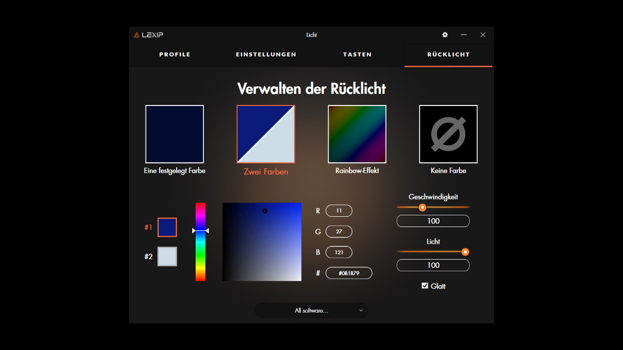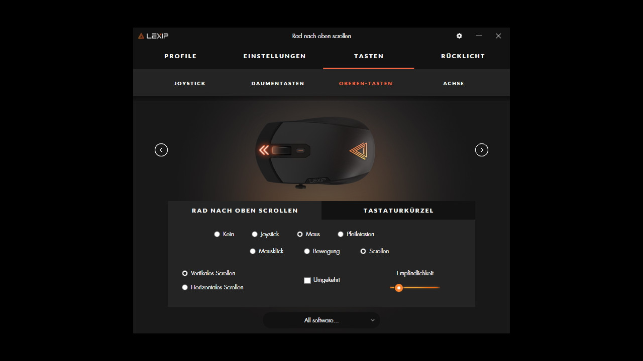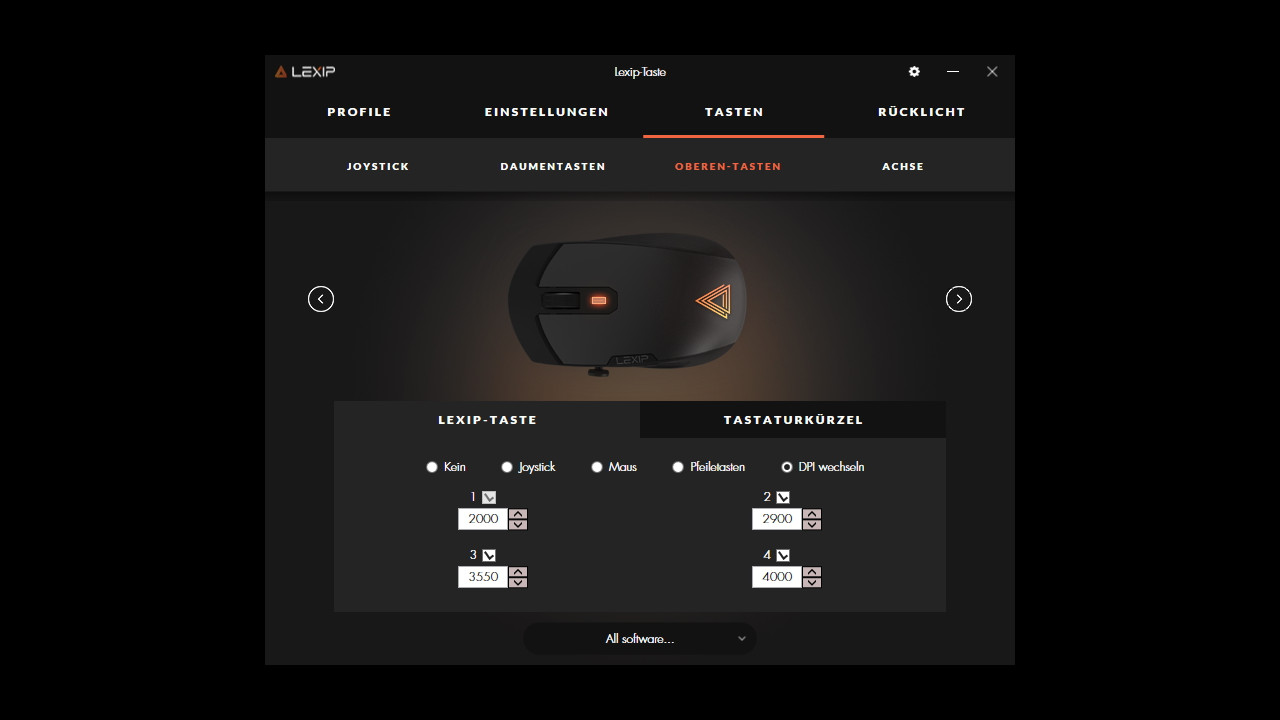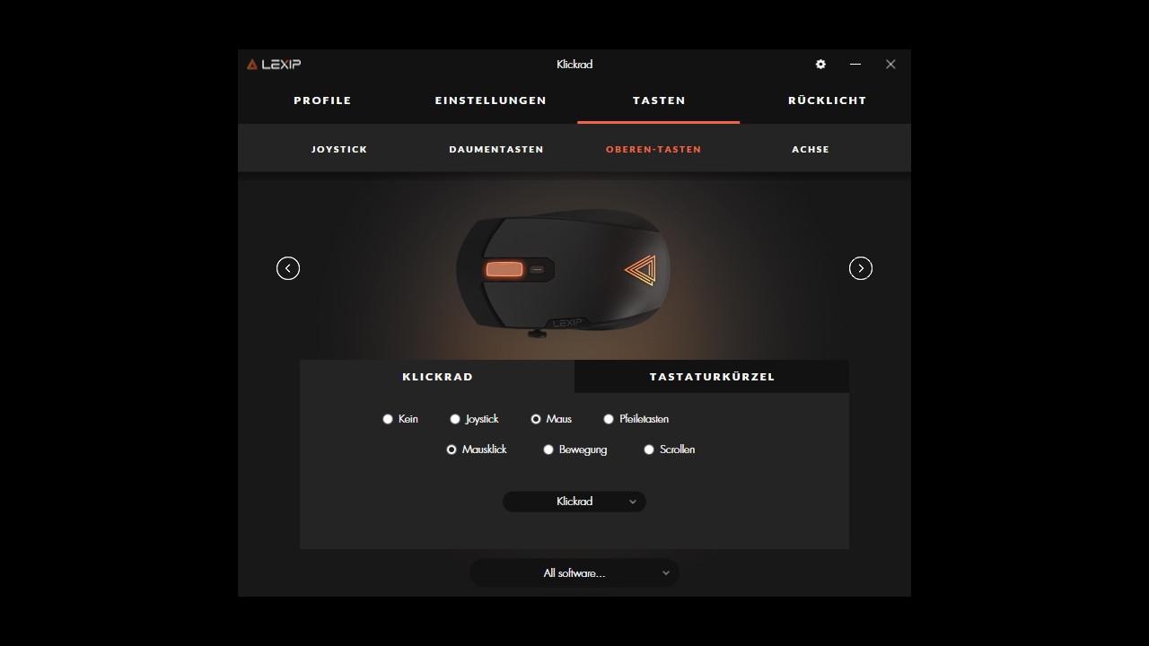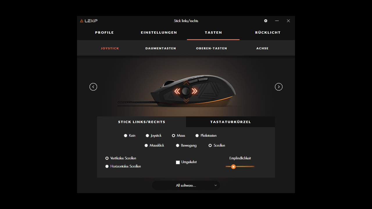 Die Software zur Lexip Pu94 Gaming Maus ist einfach und intuitiv gestaltet. Zum Anfang lassen sich Profile einrichten. Es können aber auch bereits vorgefertigte Profile für gängige Programme und beliebte Spiele direkt von der Herstellerseite geladen werden. Im Grunde bietet die Software alle wichtigen Einstellungen. Jede Taste lässt sich nach Belieben mit einer Funktion oder mit Makros belegen, dasselbe gilt auch für den Mini-Joystick und der beweglichen Basis. Was wir allerdings nicht finden, ist die Einstellung zur Abtastrate und zur Lift-Off-Distanz. Dafür gibt es wiederum einige Einstellmöglichkeiten bezüglich der Beleuchtung.