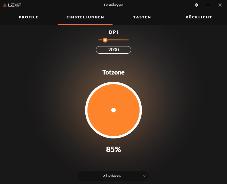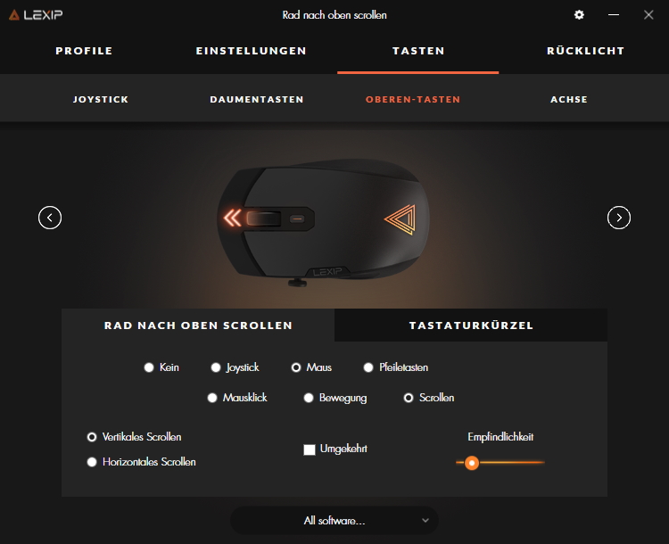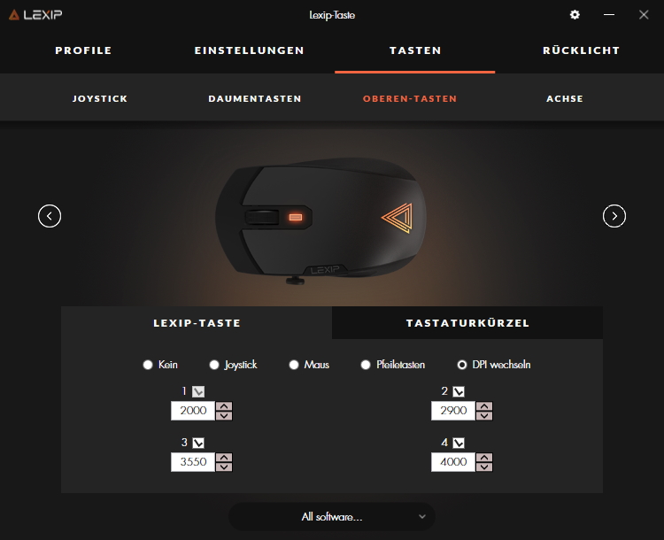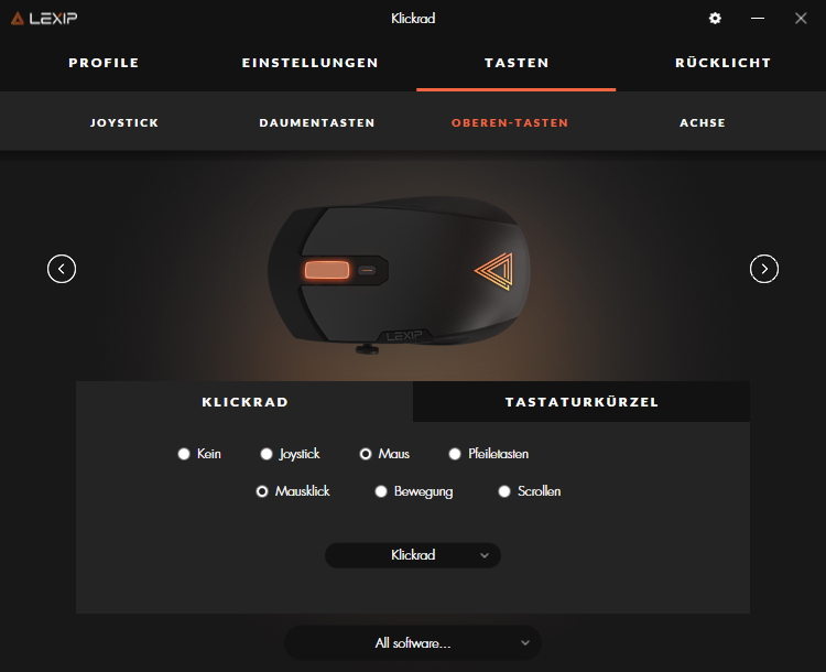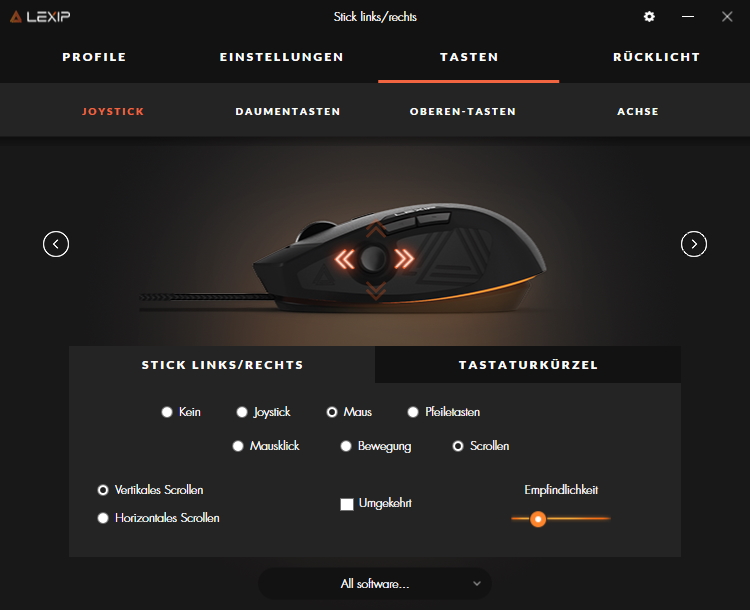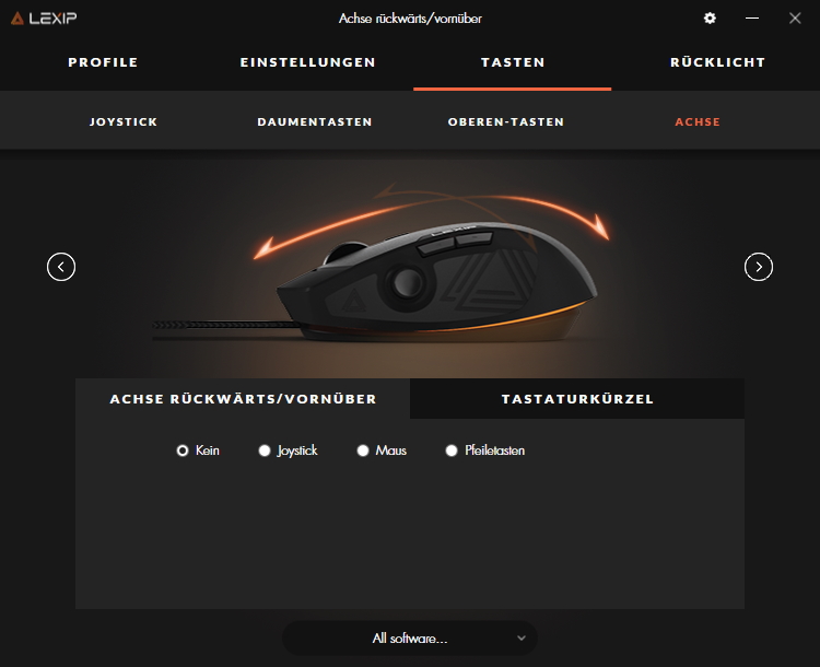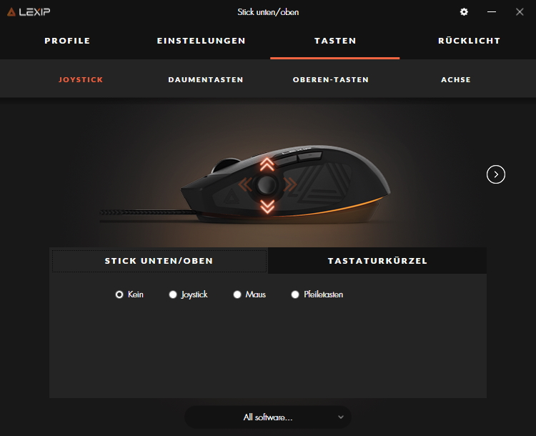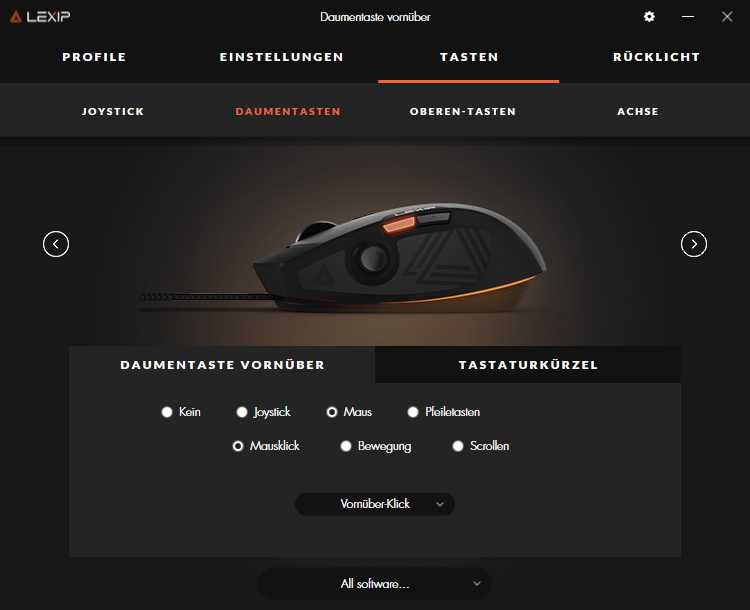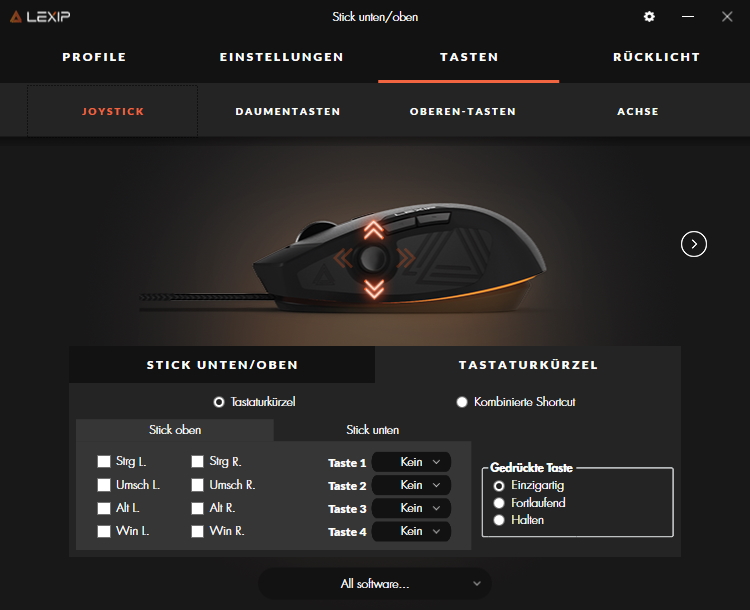 Die Software zur Lexip Pu94 Gaming Maus ist einfach und intuitiv gestaltet. Zum Anfang lassen sich Profile einrichten. Es können aber auch bereits vorgefertigte Profile für gängige Programme und beliebte Spiele direkt von der Herstellerseite geladen werden. Im Grunde bietet die Software alle wichtigen Einstellungen. Jede Taste lässt sich nach Belieben mit einer Funktion oder mit Makros belegen, dasselbe gilt auch für den Mini-Joystick und der beweglichen Basis. Was wir allerdings nicht finden, ist die Einstellung zur Abtastrate und zur Lift-Off-Distanz. Dafür gibt es wiederum einige Einstellmöglichkeiten bezüglich der Beleuchtung.