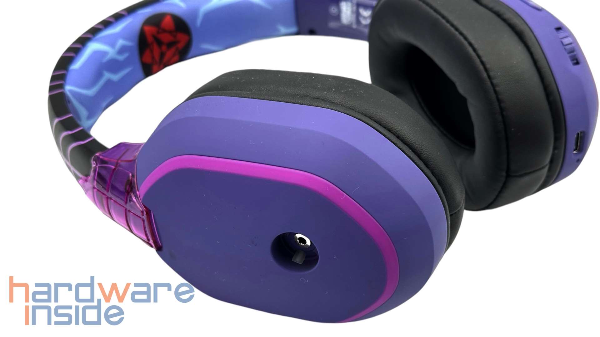 Schon beim ersten Blick auf das Lexip x Tsume Naruto Shippuden Sasuke Revenge Headset fällt auf, dass es vom Design her sehr aus der Masse heraussticht. Das liegt nicht nur an der ungewöhnlichen Farbgebung aus hellem und dunklem Lila, Blau und Schwarz, sondern auch an den Designelementen zwischen Ohrmuscheln und Kopfband. Denn während der Kopfhörer überwiegend aus Kunststoff mit matter Oberfläche gefertigt ist, bestehen diese Designelemente aus einem lilafarbenen durchsichtigen Kunststoff. Auf der rechten Ohrmuschel finden wir das farblich angepasste Logo des Herstellers, welches von einem Streifen umrandet wird. Die linke Seite ist im Design ähnlich, jedoch gibt es hier statt dem Logo des Herstellers einen Anschluss für das Mikrofon. Schade finden wir, dass der Anschluss freilegt und keine Möglichkeit der Abdeckung vorhanden ist.