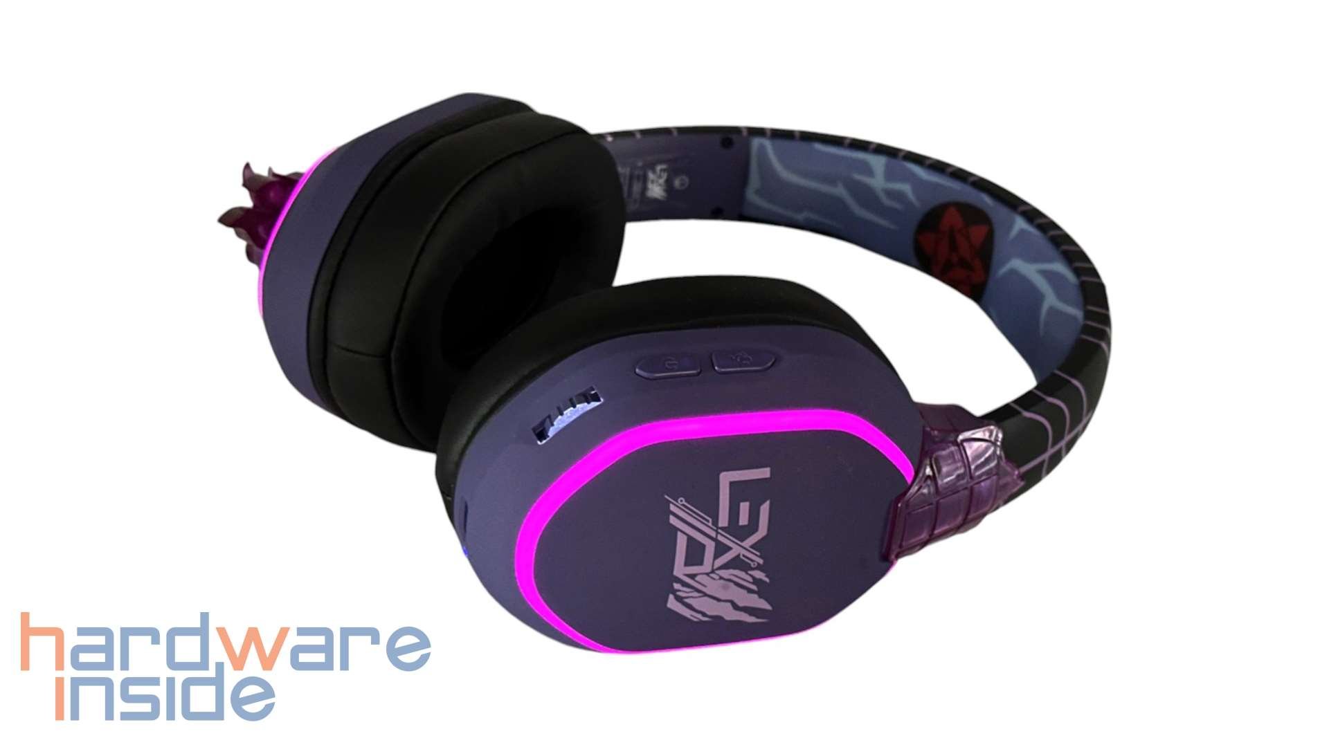 An den Außenseiten der Ohrmuscheln wird die lilafarbene Umrandung durch mehrere LEDs ausgeleuchtet. Dabei ist die Beleuchtung statisch, hier lassen sich weder Farbe noch die Helligkeit beeinflussen. Immerhin ist eine Taste vorhanden, mit der sich die Beleuchtung ausschalten lässt.