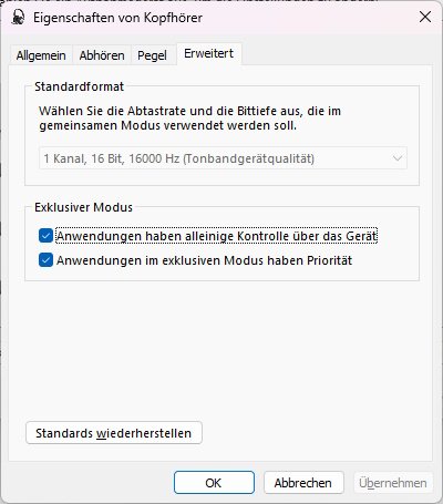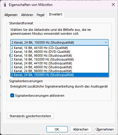 Über die Kabelverbindung ergeben sich nun auch ganz andere Möglichkeiten. So erhalten wir hier nun alle Standardformate, welche durch unsere Soundkarte unterstützt wird. Damit sollten Aufnahmen am Ende deutlich besser anhören als über die Bluetooth-Verbindung.