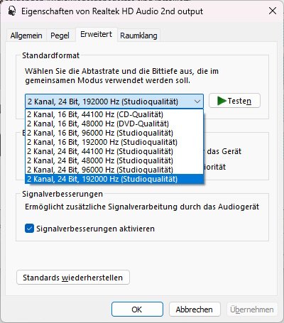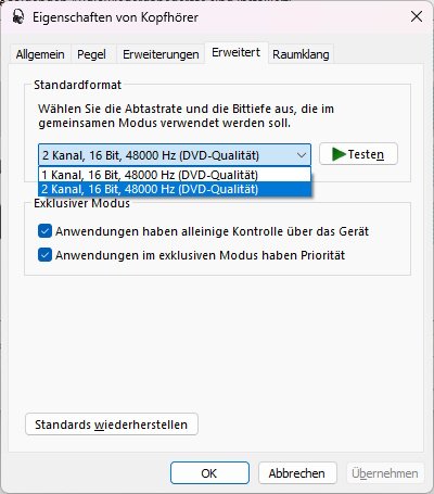 Beim Standardformat der Wiedergabe sieht die Sache schon etwas besser aus. Zwar ist auch hier keine Studioqualität auswählbar, aber immerhin können wir hier Audio in DVD-Qualität abspielen. Am Ende werden nur das Probehören und die Testaufnahmen zeigen, ob die angegebene Qualität zumindest für die Kommunikation im Gaming-Bereich ausreichend ist.