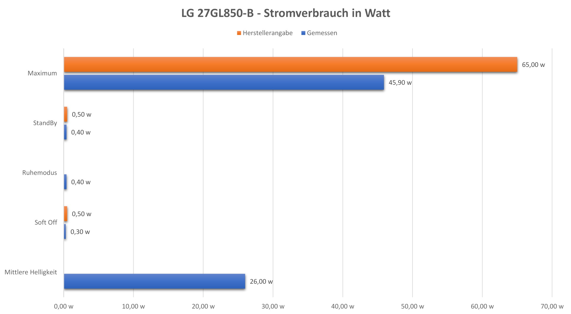 Der Hersteller gibt den maximalen Stromverbrauch mit 65 Watt überdimensioniert an. Im Maximum messen wir einen Verbraucht von 57 Watt. Bei dem Verbrauchswerten im Ruhemodus und Soft-off sind die Angaben des Herstellers etwas näher an unseren Messergebnissen. Im Stand-by messen wir 0,4 Watt, und im Soft-off bewegt sich der Stromverbrauch zwischen 0,2 und 0,3 Watt. Die Schwankung des Stromverbrauchs sind bei mittlerer Helligkeit recht hoch, denn unser Strommessgerät zeigt uns einen Verbrauch zwischen 24,9 und 26 Watt an. Das Netzteil verbraucht 0,1 Watt, wenn es nirgends angeschlossen ist.