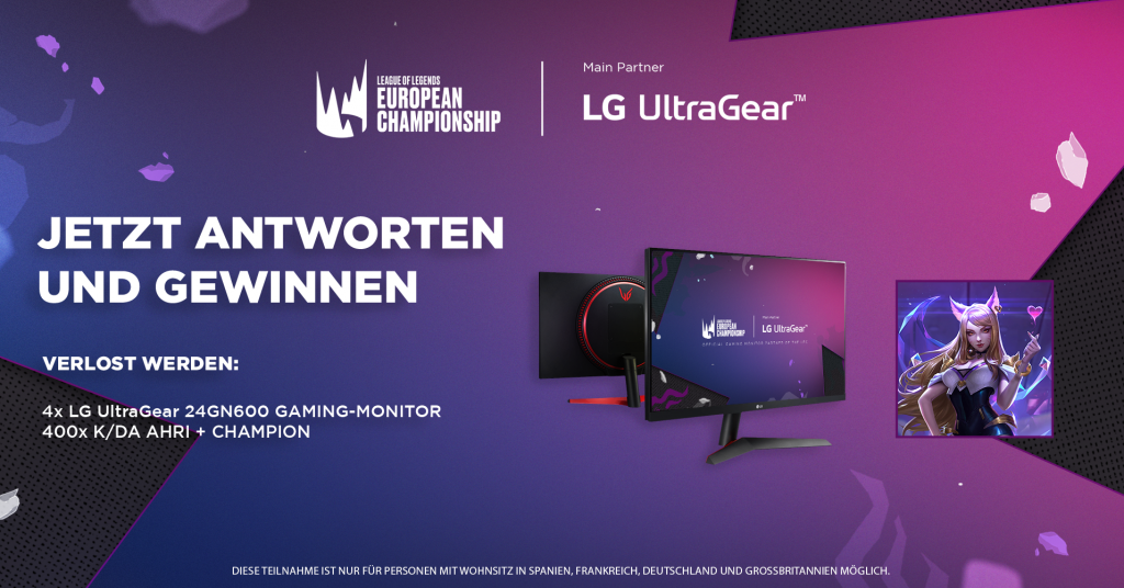 LG hat für mehrere europäische Märkte Giveaways vorbereitet, um die Eröffnung der Sommersaison 2022 zu feiern. Ab dem 17. Juni wird LG drei Wochen lang auf lg.com/de/ultragear-monitore League-of-Legends-Items an Spieler verteilen. Follower des offiziellen Twitter-Accounts @UltraGearGaming können nützliche Spielgegenstände gewinnen, wenn sie das Spiel der Woche richtig vorhersagen.