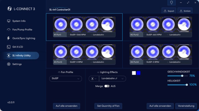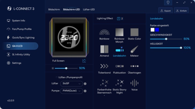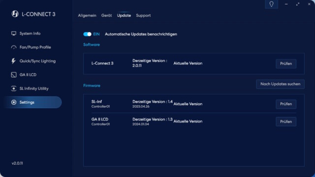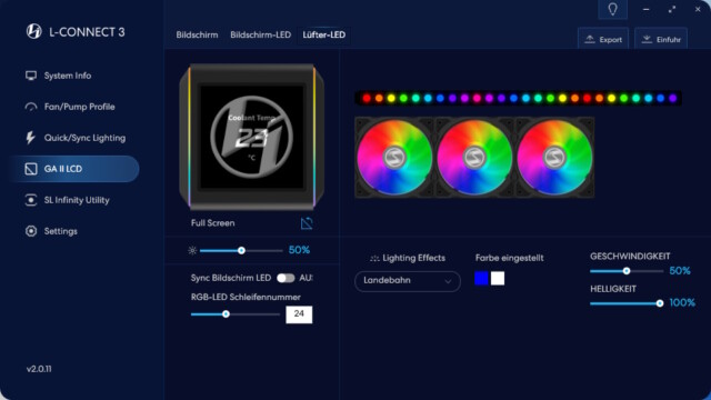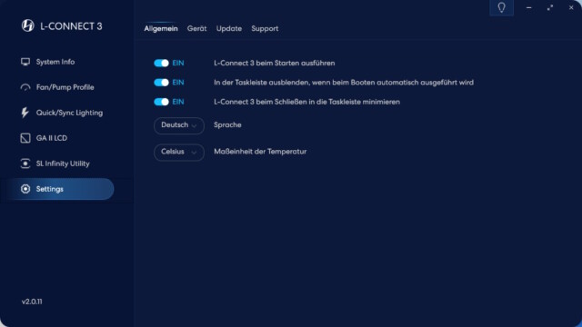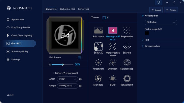Die Installationsdatei der L-Connect 3 Software ist 462 MB groß und ist dementsprechend fix heruntergeladen. Zum Start begrüßt uns die Software mit dem Dashboard, welches uns einiges an Information zu unserem System liefert. In der Rubrik „Fan/Pump Profile“ können wir die Drehzahlen für die Pumpe und die Lüfter einstellen, Profile erstellen oder vordefinierte Profile aktivieren. In der nächsten Rubrik geht es zum ersten Mal an die Beleuchtung, diese kann hier mit dem Mainboard synchronisiert werden. Spannend wird es dann in der Rubrik „GA III LCD“. Hier können wir sämtliche Einstellungen zum Display vornehmen, so können wir hier entweder Animationen, kurze Videos oder Bilder auswählen und uns diverse Werte unseres Systems anzeigen lassen. Zudem lassen sich hier auch die RGB LEDs des Kühlers steuern und die Drehzahl einstellen. Insofern RGB-Lüfter direkt am Kühler angeschlossen sind, kann deren Beleuchtung auch direkt hier gesteuert werden. Unter der Rubrik „SL Infinity Utility“ lassen sich die Lüfter in Beleuchtung und Drehzahl einstellen. Hier gibt es eine Fülle an Möglichkeiten, sodass man sich hier erst einmal einfinden muss. Zum Ende bekommen wir noch weitere Einstellungsmöglichkeiten wie der Sprache der Software, Updates von Soft- und Firmware und noch einiges mehr.