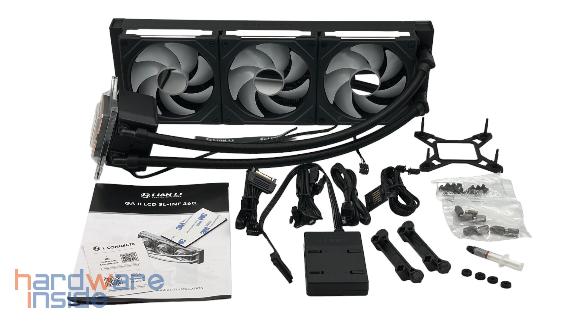 Im Lieferumfang finden wir den Radiator mit vormontierten Lüftern. Wie es bei solchen Kühlungen typisch ist, ist die Einheit aus Pumpe und Kühler bereits mit dem Radiator verbunden und das System ist vorbefüllt. Dazu gibt es Montagesets mit deren Hilfe sich die Kühlung auf diversen Sockeln von Intel als auch von AMD montieren lässt. Weiter finden wir Schrauben zur Montage des Radiators im Gehäuse, diverse Kabel und einen Controller für die Lüfter. Eine kleine Spritze mit Wärmeleitpaste sowie eine Bedienungsanleitung sind ebenfalls dabei.