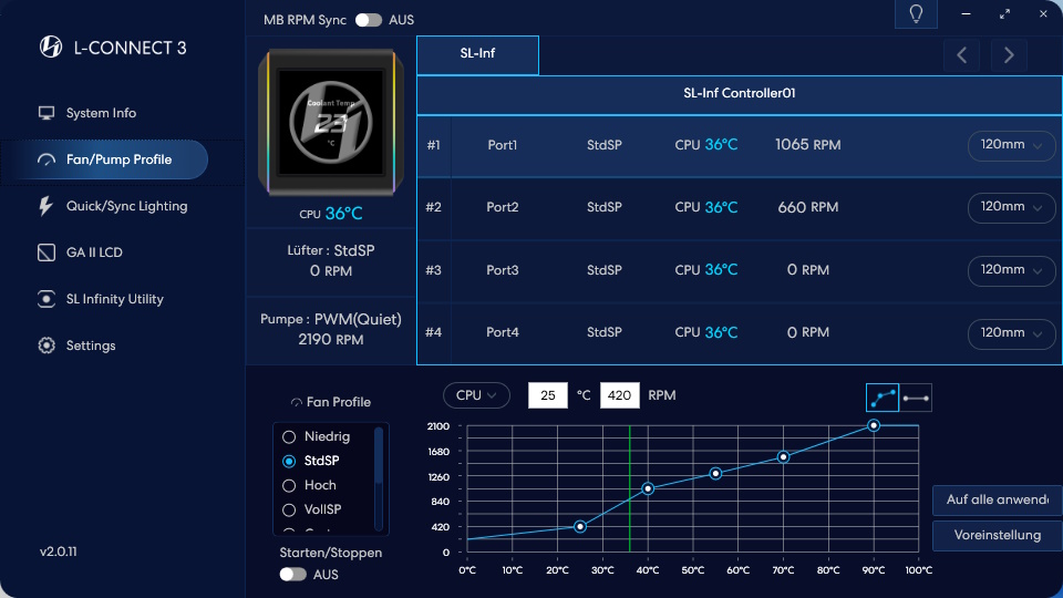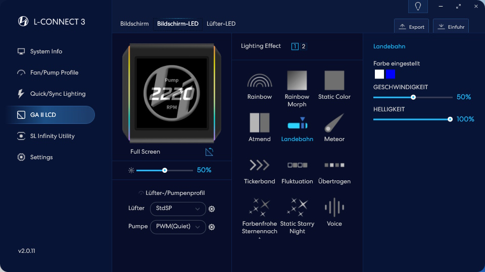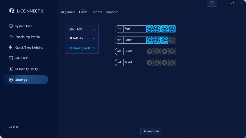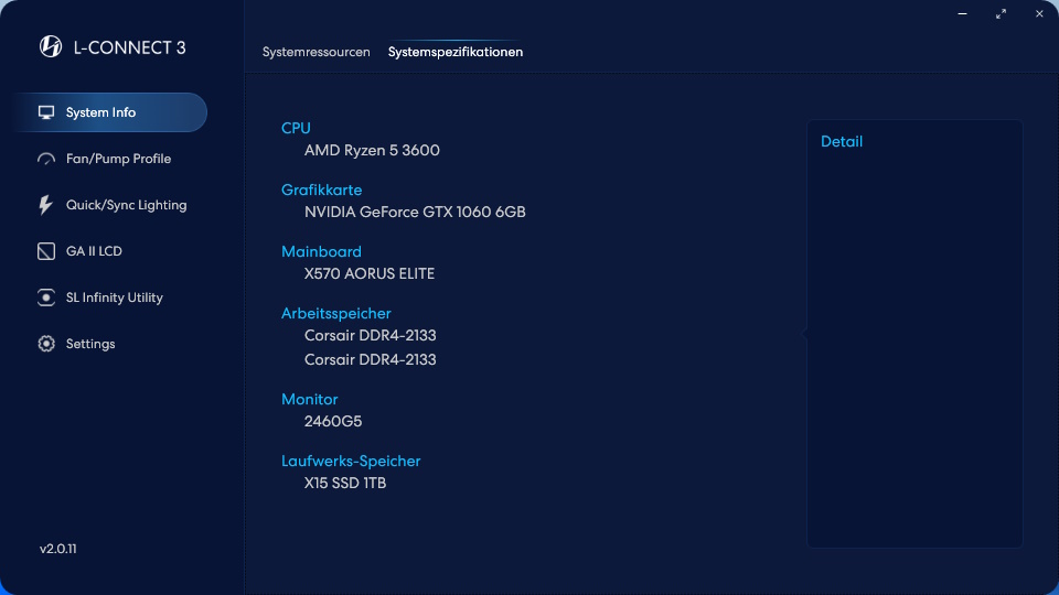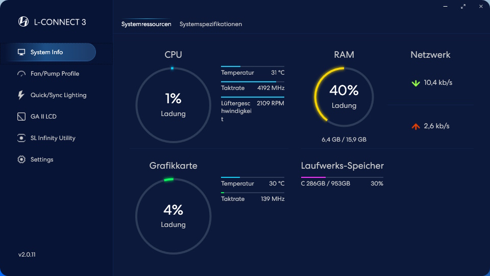 Die Installationsdatei der L-Connect 3 Software ist 462 MB groß und ist dementsprechend fix heruntergeladen. Zum Start begrüßt uns die Software mit dem Dashboard, welches uns einiges an Information zu unserem System liefert. In der Rubrik „Fan/Pump Profile“ können wir die Drehzahlen für die Pumpe und die Lüfter einstellen, Profile erstellen oder vordefinierte Profile aktivieren. In der nächsten Rubrik geht es zum ersten Mal an die Beleuchtung, diese kann hier mit dem Mainboard synchronisiert werden. Spannend wird es dann in der Rubrik „GA III LCD“. Hier können wir sämtliche Einstellungen zum Display vornehmen, so können wir hier entweder Animationen, kurze Videos oder Bilder auswählen und uns diverse Werte unseres Systems anzeigen lassen. Zudem lassen sich hier auch die RGB LEDs des Kühlers steuern und die Drehzahl einstellen. Insofern RGB-Lüfter direkt am Kühler angeschlossen sind, kann deren Beleuchtung auch direkt hier gesteuert werden. Unter der Rubrik „SL Infinity Utility“ lassen sich die Lüfter in Beleuchtung und Drehzahl einstellen. Hier gibt es eine Fülle an Möglichkeiten, sodass man sich hier erst einmal einfinden muss. Zum Ende bekommen wir noch weitere Einstellungsmöglichkeiten wie der Sprache der Software, Updates von Soft- und Firmware und noch einiges mehr.