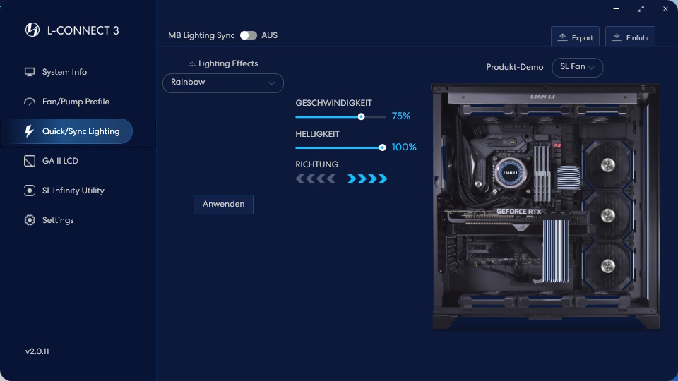 Die Steuerung der Lian Li GALAHAD II LCD SL-INF 360 erfolgt über eine Software namens L-Connect 3. Diese ist auf der Seite des Herstellers zu finden, hier sollte man unbedingt die Hinweise des Herstellers beachten. Etwas merkwürdig finden wir, dass der Hersteller die Software über eine Google-Drive Cloud zum Download anbietet.