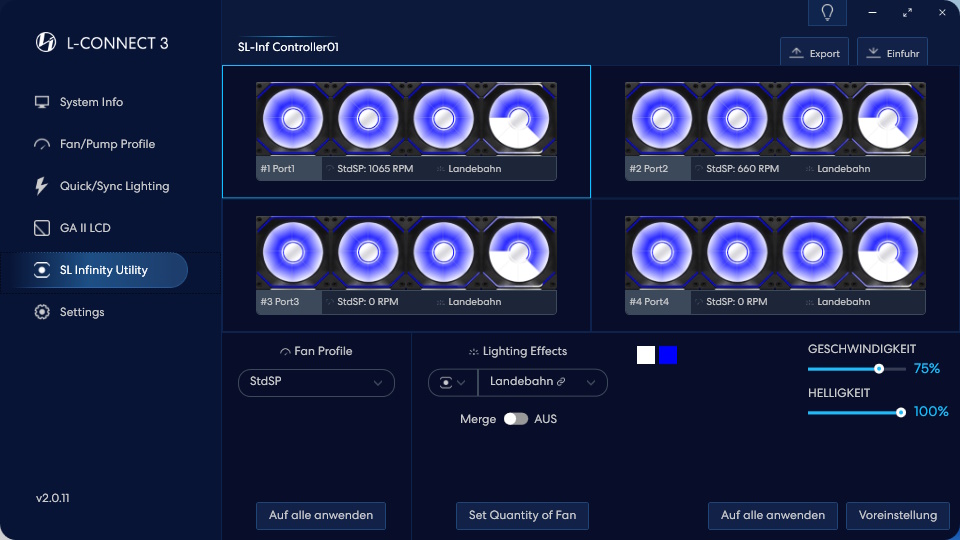 | Lüfter | Modell: Lian Li UNI FAN SL-INF Abmessungen: 122,1 x 120 x 25 mm (L x B x H) Lager: Fluiddynamisches Lager (FDB) Drehzahl: 200 – 2.100 U/min. Druck: 2.66 mmH²O (max.) Airflow: 61.3 CFM (max.) Lautstärke: 29 dB (A) |