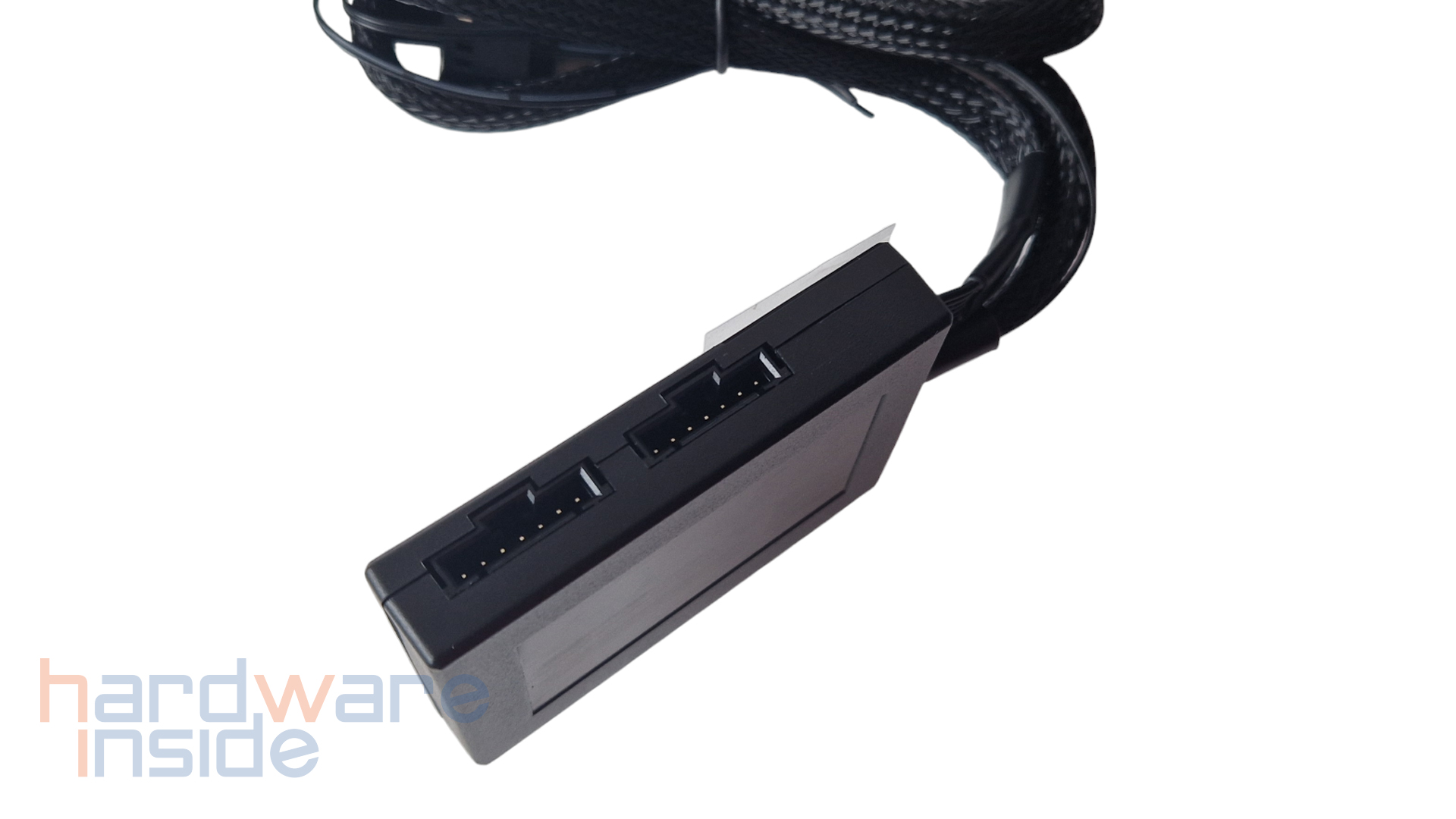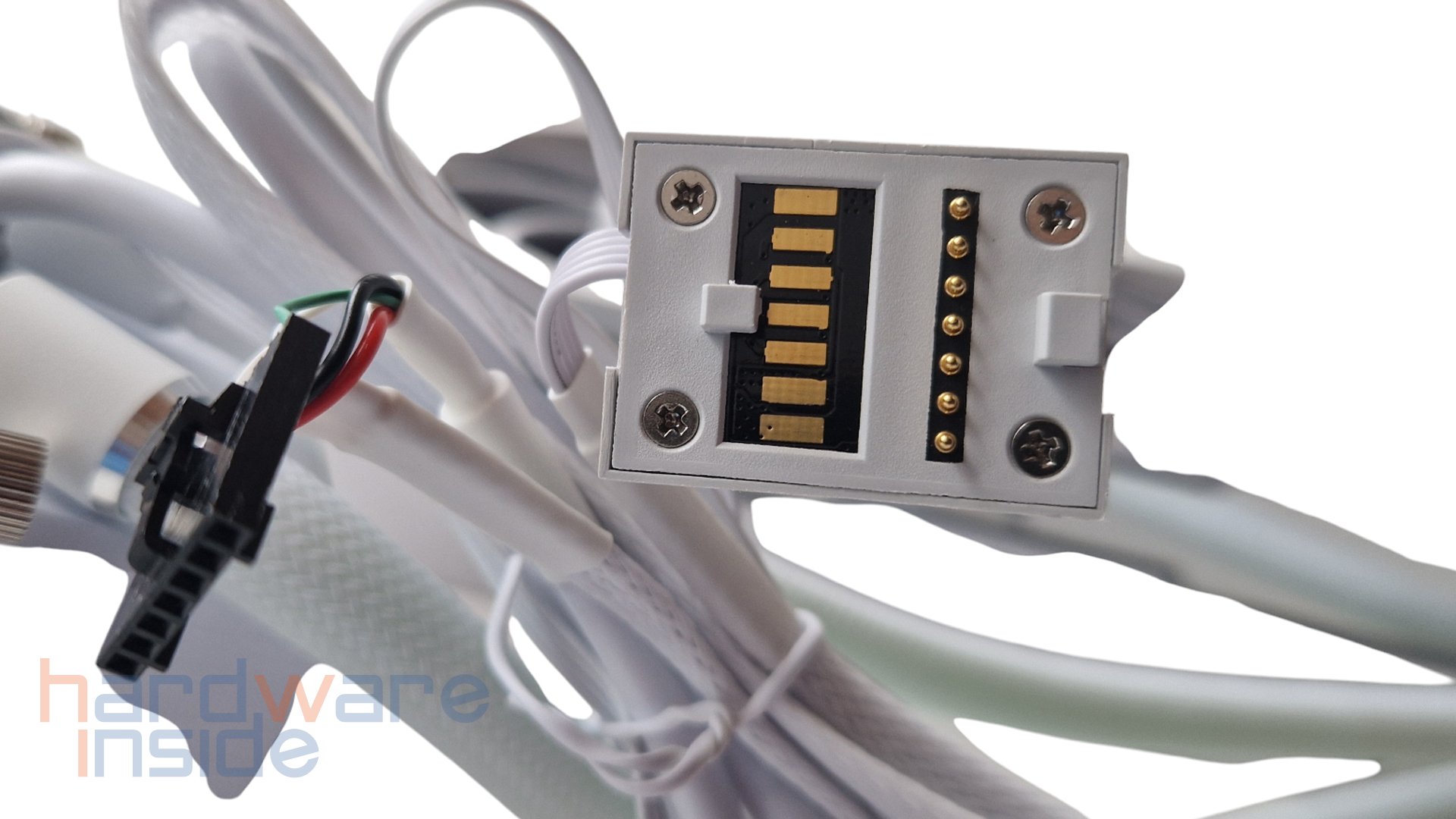 Das Pumpengehäuse verfügt über Anschlüsse für das LCD-Panel (USB 2.0-Header), die PWM-Steuerung der Pumpe, der Lüfter und die SATA-Stromversorgung. Der Anschluss der Lüfter und des ARGB erfolgt über den breiten Stecker, der direkt mit einem der drei Lüfter verbunden wird.