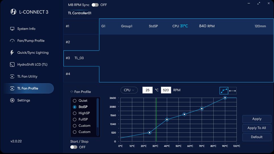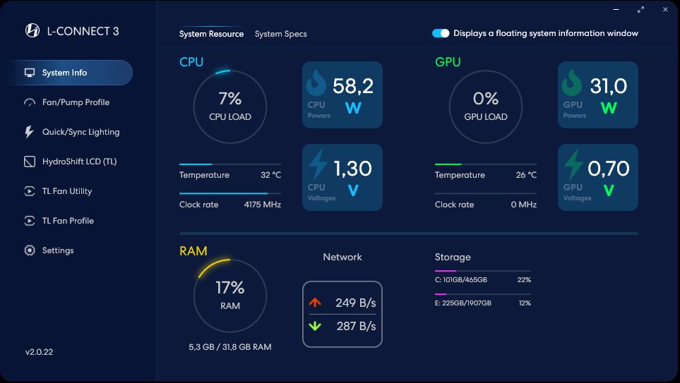 Die L-Connect 3 Software kann auf der Herstellerseite heruntergeladen werden und bietet dem Endverbraucher eine Vielzahl von Einstellmöglichkeiten. Alle wichtigen Informationen befinden sich bereits auf der Hauptseite, von Temperaturdaten bis hin zu allen relevanten Daten der CPU und der Spannung werden aufgelistet.
