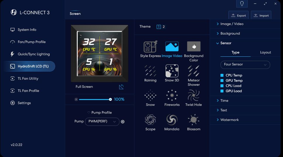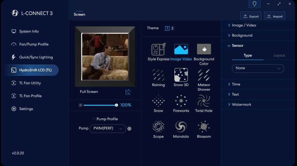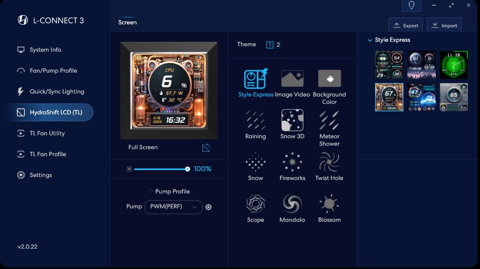 Über den Reiter „Hydroshift LCD (TL)“ kommen wir nun zum Herzstück des Ganzen, dem 2,88 Zoll Display. Es können nicht nur bereits sechs hinterlegte Styles angewandt, auch zeitgleich verschiedene Hardware Daten auf dem Display angezeigt werden. Die Helligkeit kann von 0 – 100% entsprechend angepasst werden. Zudem besteht die Möglichkeit das Display in 90° Grad-Schritten zudrehen.