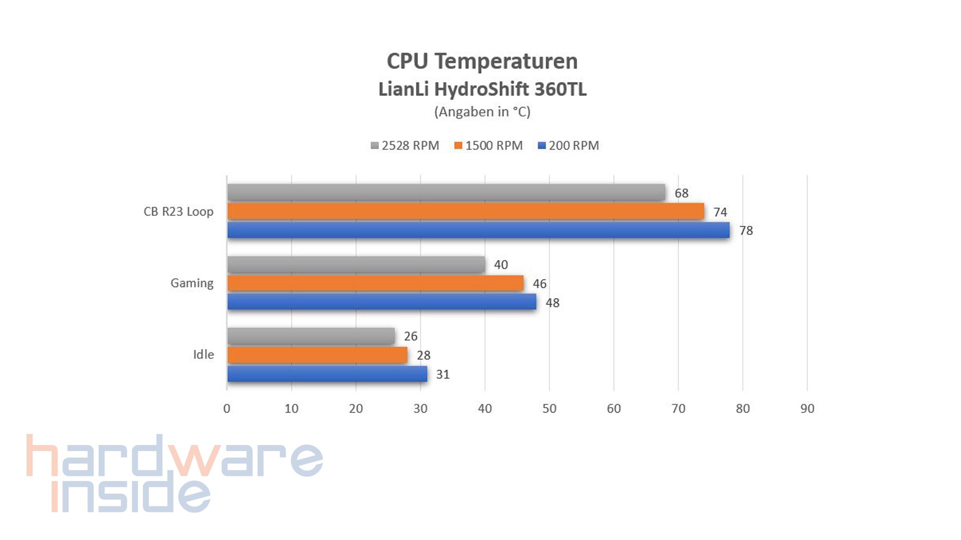 Richten wir nun unser Augenmerk auf die Kühlungsleistung der Lian Li HydroShift LCD 360TL. Zunächst haben wir mithilfe unserer Mainboard-Software die Drehzahlen aller verbauten Lüfter ermittelt. Laut der Sotware war ein min. Wert von 200 U/min. möglich.