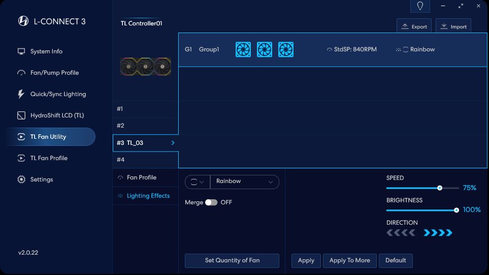 Unter dem Reiter TL Fan Utility können sowohl die RGB der einzelnen Lüfter, Lüfter-Profile sowie grob die Geschwindigkeit und die Helligkeit eingestellt werden. Ebenfalls kann die Laufrichtung abgeändert werden.