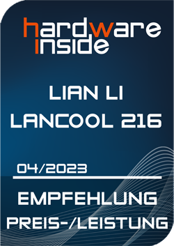 Das Lian Li LANCOOL 216 ist für seinen günstigen Preis von derzeit 108,90 Euro ein qualitativ hochwertiges Gehäuse. Dabei lässt es sich durch seine Features sehr gut an die eigenen (Kühlungs-)Bedürfnisse anpassen. Die zahlreichen Lüfter-Plätze sowie die Möglichkeit zwei 360 mm Radiatoren, sowie einen 240 mm Radiator zu installieren, dürften hier keine Wünsche offenlassen. Wird vom Kunden mehr Wert auf eine ansprechende Optik gelegt, so wurde auch hieran beim LANCOOL 216 gedacht. So sorgt das versetzbare Front-I/O für eine saubere Optik an der Front, während die Möglichkeit zur leichten vertikalen Montage der GPU die Hardware noch besser in Szene setzt. Deshalb vergeben wir an das Lian Li LANCOOL 216 unseren Preis-/Leistungsaward.