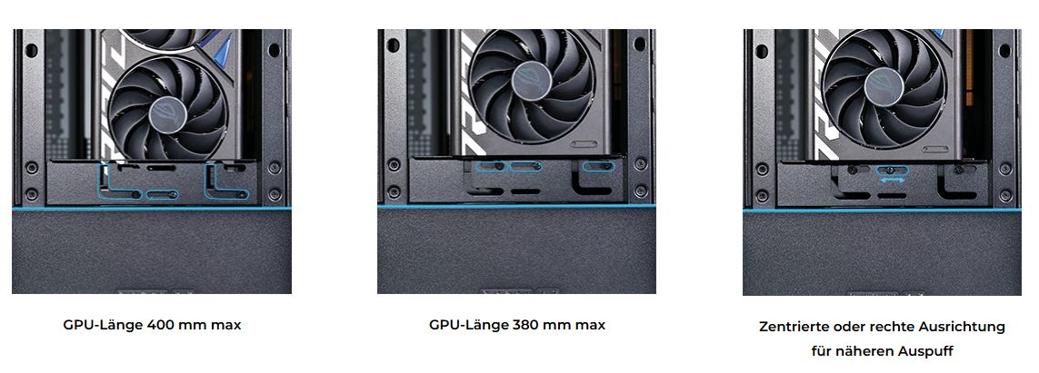Im SUP01 können GPUs mit einer Dicke von bis zu vier Steckplätzen installiert werden. Die GPU-Halterung ist sowohl für vertikale als auch horizontale Anpassungen konzipiert, um GPUs unterschiedlicher Längen und Größen aufzunehmen. Des Weiteren besteht die Möglichkeit, eine Halterung an der Oberseite entsprechend der Länge (310–400 mm) oder Dicke der GPU anzupassen, um z. B. die Stabilität der GPU während des Transports zu gewährleisten.