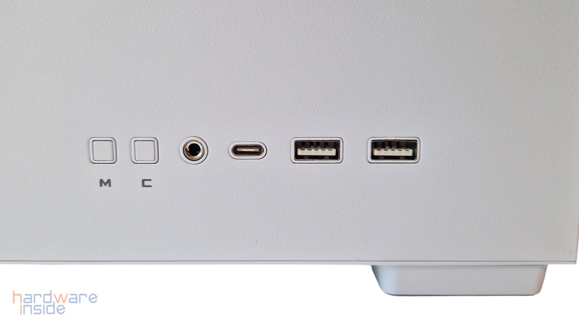Das I/O Panel des SUP01, welches sich an der unteren linken Seitenwand befindet, gewährleistet einen unkomplizierten Zugang zur Steuerung der Lichteffekte (M) für die ARGB-Streifen. Diese sind sowohl um die obere linke als auch um die vordere Netzteilabdeckung sowie auf den PCIe-Riser-Halterungen platziert und bieten insgesamt sechs Beleuchtungsmodi zur individuellen Anpassung. Die Belegung von links nach rechts stellt sich wie folgt dar: