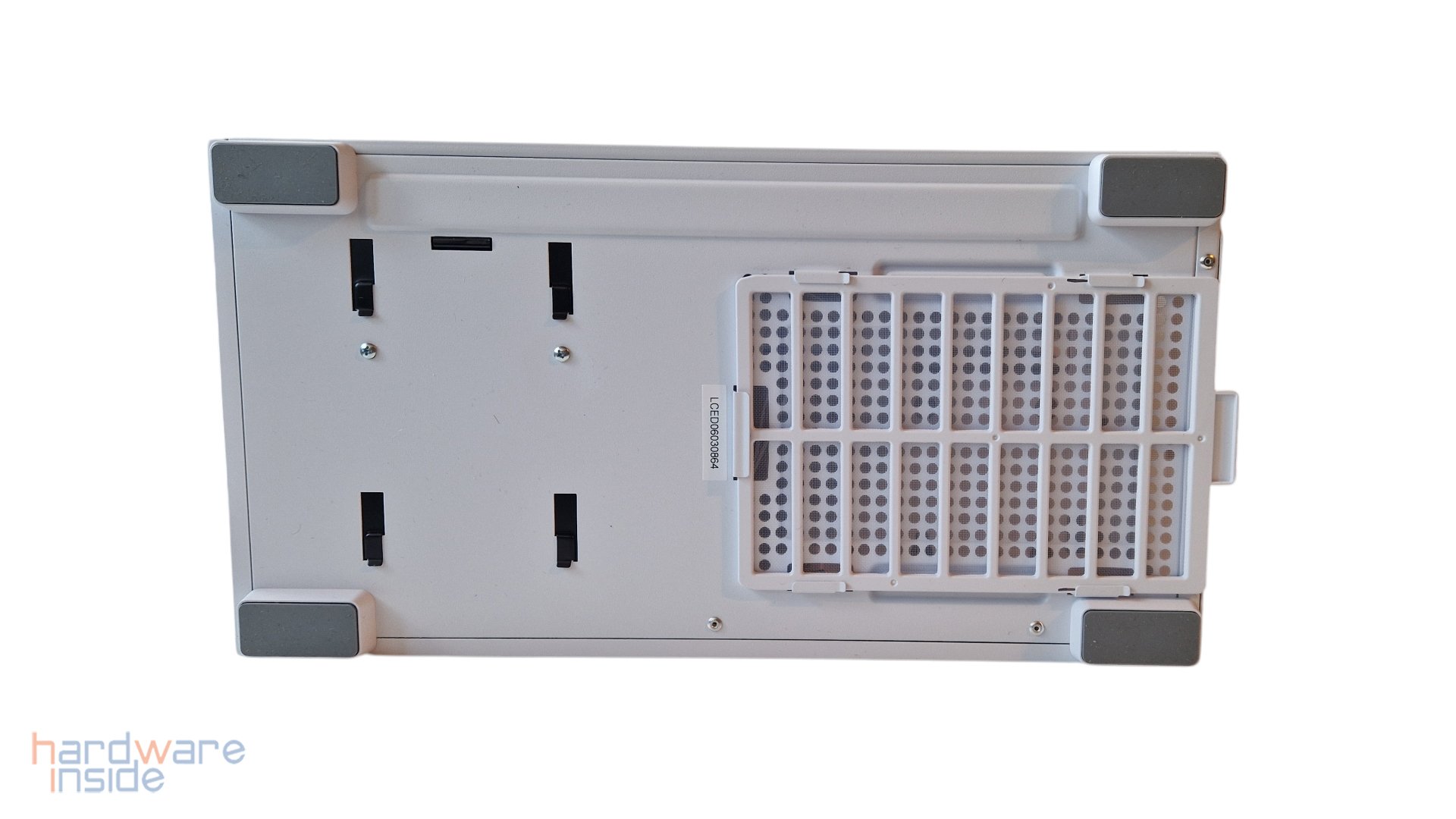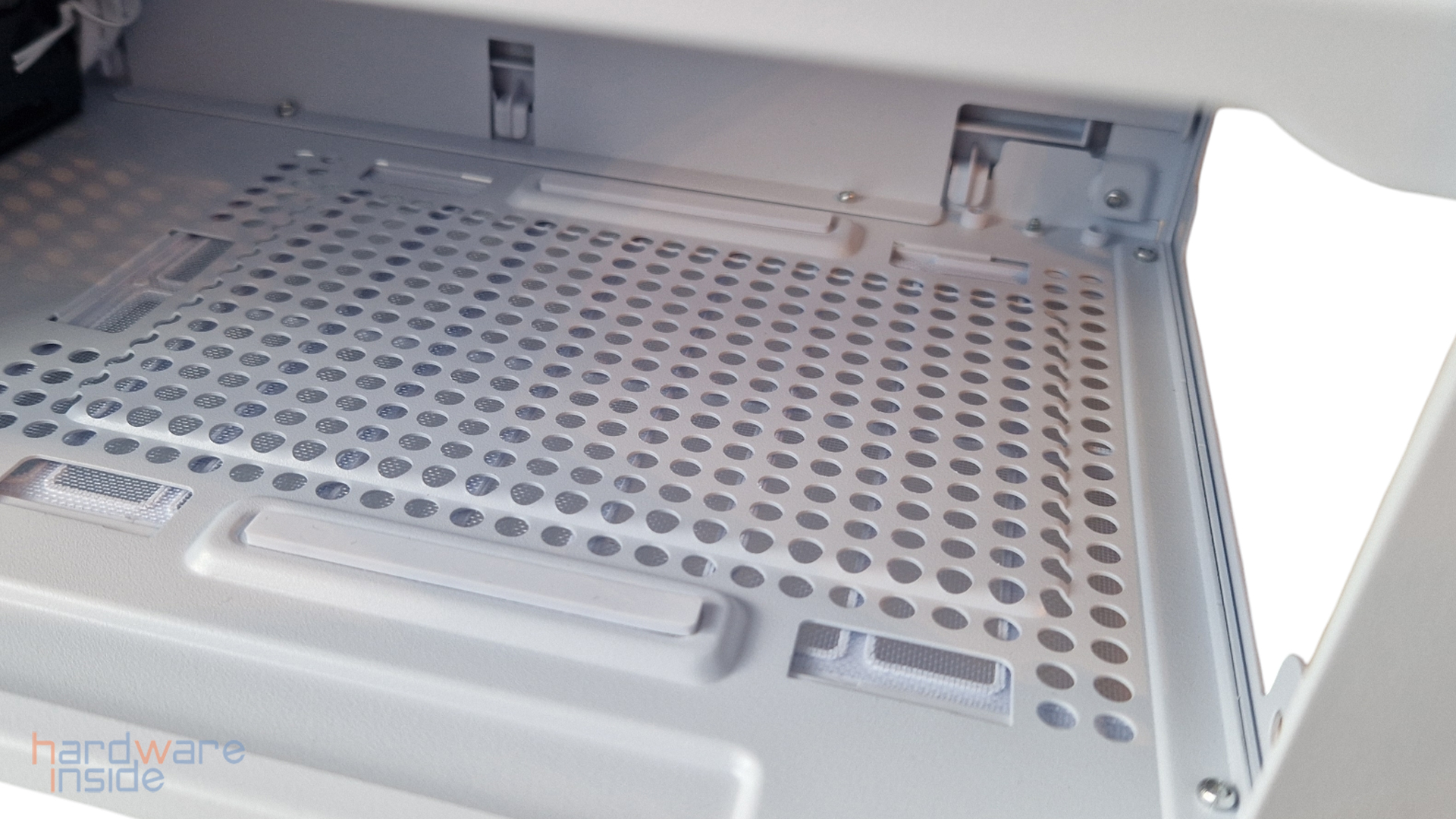 Die Oberseite des SUP01 besteht aus einem abnehmbaren Mesh-Gitter, auf dessen Unterseite sich ein entnehmbarer magnetischer Staubfilter befindet. Für die Demontage des Deckels muss dieser lediglich am hinteren Bereich angehoben, entriegelt und entnommen werden. Die Entnahme ist dann ebenfalls von Vorteil, um später Hardware (Radiator) zu verbauen.
