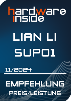 Das SUP01 bietet eine Vielzahl von Innovationen für den Endverbraucher an, welche darauf abzielen, moderne Komponenten durch unkonventionelle Lösungen effizienter zu kühlen. Insbesondere in Bezug auf die Anordnung der Grafikkarte im Frontbereich stellt dies ein durchdachtes Merkmal dar. Die drei werkseitig installierten 120-mm-Performance-Lüfter erfüllen ihre Funktion zur Zufuhr von Frischluft ins Gehäuse überzeugend während der Testphase. Zudem ergänzen die ARGB-Streifen – welche bei Bedarf deaktiviert werden können – sowie ein Spiegel im Inneren des SUP-01 das Gesamtpaket mit kleinen, aber feinen Features. Einziger Nachteil bleibt der Anschluss der Displaykabel. Dieser erfordert einerseits die Demontage des Seitenteils sowie ein Kippen des Gehäuses und gestaltet sich ungünstig für Personen mit großen Händen oder bei Verwendung eines langen DP- oder HDMI-Kabels in Situationen, wo das Gehäuse auf dem Schreibtisch positioniert werden soll. Dies als negativ anzukreiden, wäre Meckern auf hohem Niveau. Angesicht der Verarbeitung, den Features und dem nicht zu vergessenden 510 mm langen PCIe 4.0-Riserkabels welches im Lieferumfang mit enthalten ist, erscheint uns der Preis von 150 € des SUP01 gerechtfertigt im Vergleich zu anderen Angeboten am Markt. Daher sprechen wir unsere Empfehlung aus und verleihen ihm unseren Preis-Leistungs-Award.