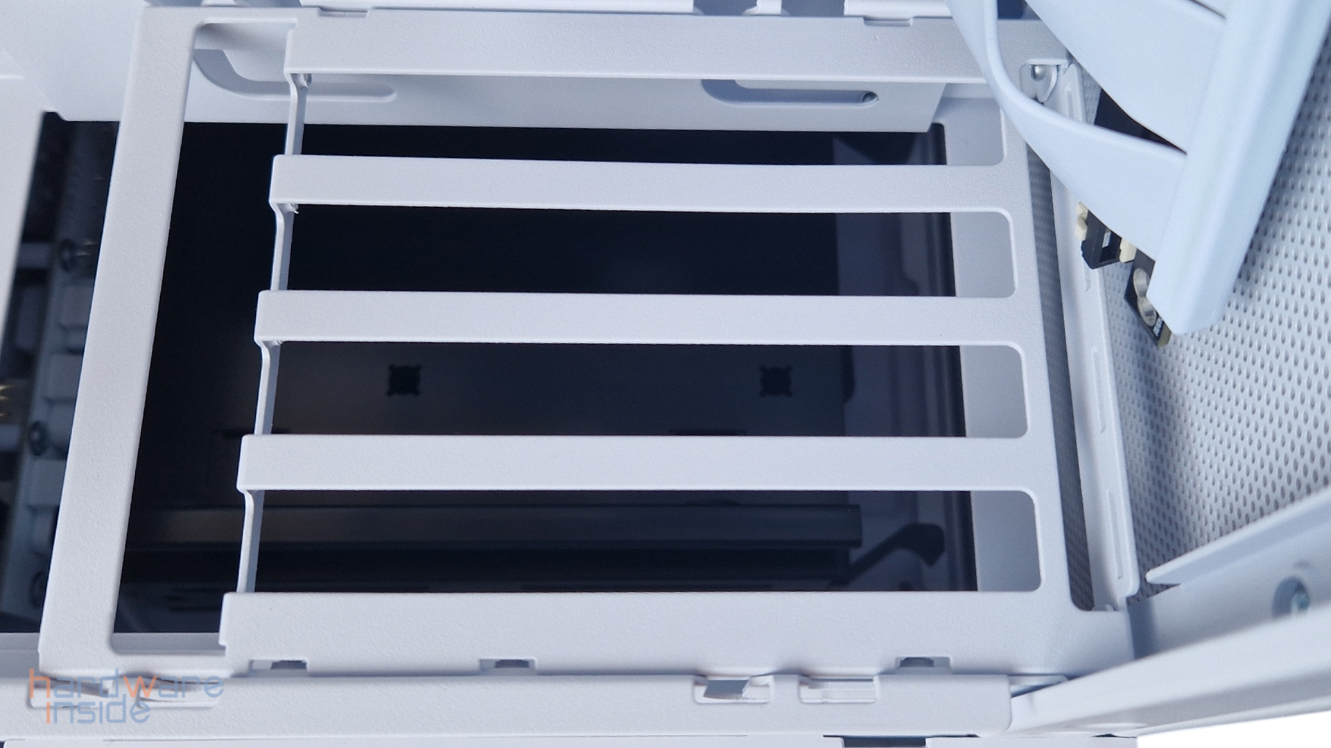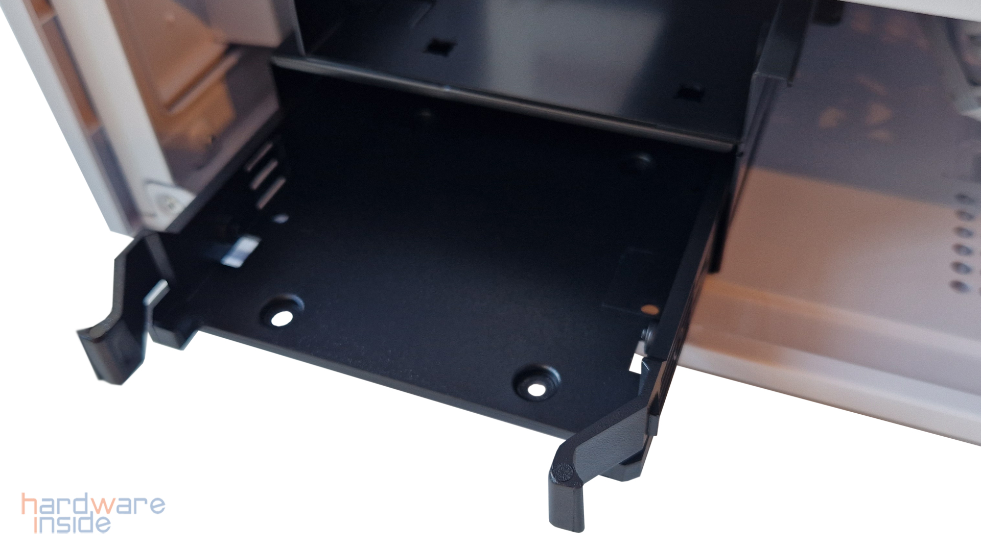 Bei dem SUP01 wurden die Laufwerkspositionierungen mit Bedacht gewählt, bei einem 45L-Gehäuse auch kein Wunder. So finden sich bis zu vier 2,5″ SSDs oder zwei 3,5″ HDDs gleichzeitig ihren Platz. Zum einen verbirgt sich unterhalb der verspiegelten Oberfläche Platz für zwei SSDs und zum anderen wird dadurch der reflektierende Look erweitert, sodass es größerwirkt. Unterhalb befindet sich noch ein Festplattenkäfig mit zwei Fächern für SSDs oder HDDs, welcher jederzeit durch Lösen der Rändelschraube entfernt werden kann, um zusätzlichen Platz für die Kabelführung zu schaffen.