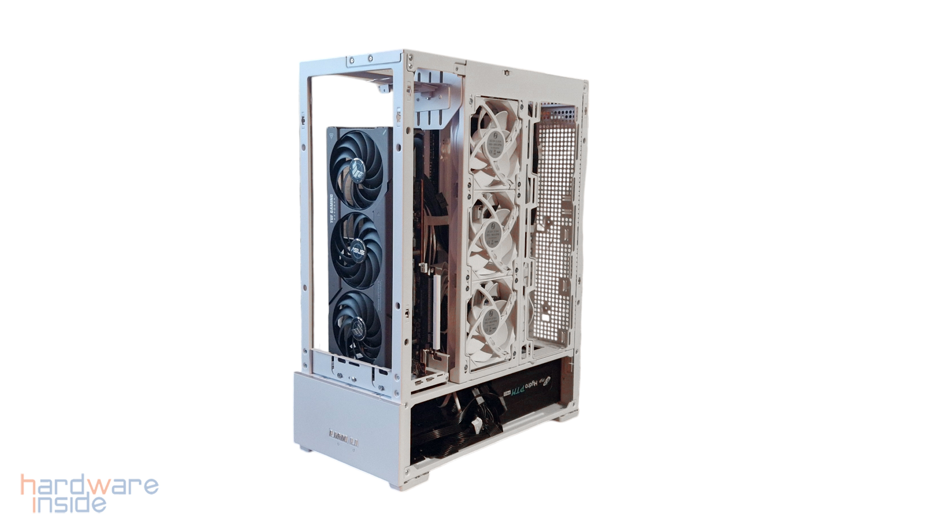 Die Frontstruktur gliedert sich in einen größeren Mesh-Bereich im oberen Teil, welcher durch einen A-RGB-Leuchtstreifen, der sich auch über die ganze linke Gehäuseseite zieht, von einem stählernen Element in Bodennähe abtrennt. Der vordere Korpus lässt sich mühelos abnehmen. Auffällig ist das Fehlen von Plätzen für Frontlüfter oder eines herausnehmbaren Lüftergitters. Stattdessen ist eine vertikale GPU-Halterung vorgesehen, die es ermöglicht, die Grafikkarte aufrecht hinter der Front zu montieren.