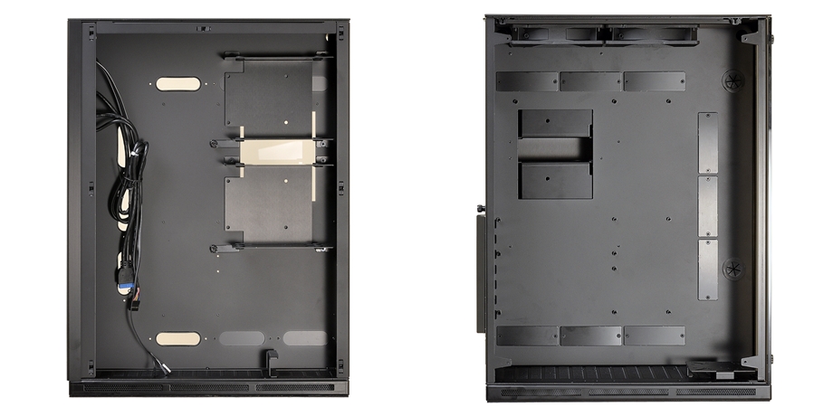 Trotz seiner kleineren Abmessungen fasst das PC-O10 nach wie vor E-ATX- und Full-ATX-, ebenso wie Micro-ATX-Mainboards. Mit sieben Erweiterungsslots unterstützt es Multi-GPU-Setups mit Grafikkarten bis 340mm Länge; genug Platz selbst für die besten Gaming-Konstruktionen. CPU-Kühler werden bis 130mm Höhe unterstützt. In die Netzteil-Abteilung passen bis zu vier 3,5“ und zwei 2,5“ Laufwerke, in der gläsernen Abteilung findet eine zusätzliche 2,5“ SSD Platz. Das Zweikammer-Layout rückt die attraktiven Komponenten ins Scheinwerferlicht, während Kabel, Laufwerke und weniger interessante Teile verborgen bleiben.