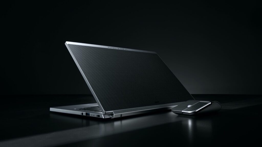 Jedes Detail des Porsche Design Acer Book RS dient einem bestimmten Zweck – es folgt damit der Designphilosophie von Porsche Design, die Funktionalität eines Gegenstandes in den Vordergrund zu stellen und zu optimieren. Das luxuriöse Notebook verdankt seine individuelle Optik maßgeblich dem 3K-Kohlefaser-Cover sowie dem diamantgeschliffenen und CNC-gefrästen Chassis. Zusammen mit dem silberfarbenen Gehäuse entsteht so ein markanter Kontrast, der dem Gerät einen eigenständigen Look verleiht. Display und Chassis des Notebooks sind mit einem Unibody-Scharnier verbunden, durch das die Tastatur beim Öffnen des Notebooks leicht angehoben wird und so eine ergonomischere Haltung beim Tippen ermöglicht sowie die Kühlung verbessert. Zusätzlich ist die Tastatur hintergrundbeleuchtet, um auch das Arbeiten bei schlechten Lichtverhältnissen zu ermöglichen. Das Präzisions-Touchpad aus Glas unterstützt Multi-Touch-Funktionen für intuitivere Eingaben.