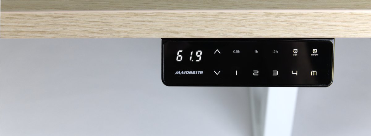 Eines der Highlights der Maidesite S2 Pro Plus ist die Tischsteuerung, mit welcher die Höhe des Tisches beeinflusst werden kann. Das Gehäuse besteht aus Kunststoff, macht aber einen sehr guten Eindruck. Die Höhe wird durch die linken Pfeiltasten konfiguriert, ein Display zeigt dabei die aktuelle Einstellung in cm an. Mithilfe der m-Taste (Memory-Funktion) lässt sich die gerade eingestellte Höhe auf die Schnelltasten eins bis vier legen. Das ermöglicht ein schnelles Durchwechseln unterschiedlicher Konfigurationen. Auf der oberen Zeile kann eine Weckerfunktion auf 30 Minuten, eine oder zwei Stunden gestellt werden. Bei ablaufen der eingestellten Zeit gibt die Steuerung eine Vibration von sich, die auch trotz genutzer In-Ear Kopfhörer wahrgenommen werden kann. Auf der rechten Seite wurde ein USB-Port eingelassen, über welchen Geräte mit Strom versorgt werden können.