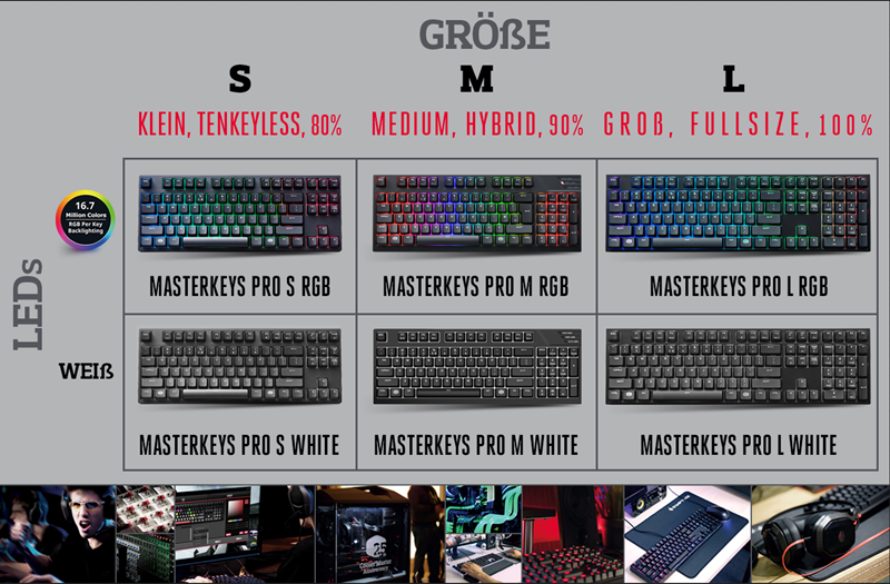„Mit der Einführung dieser beiden Tastaturen können wir unser MasterKeys Pro Portfolio nun vervollständigen. Dadurch machen wir dem Kunden die Wahl einer Tastatur noch leichter“, sagt Carter Salley, Peripheral Product Manager. „Einfach die Größe und die LED Farbe aussuchen (weiß oder RGB?). Einfacher geht es nicht. Klein / S / Tenkeyless / 80%, mittel / M / Hybrid / 90%, groß / L / Fullsize / 100%), mittel oder groß; weiße LEDs oder RGB. Für jede Größenvorliebe und für alle Beleuchtungswünsche haben wir die perfekte Antwort für Anwender, die auf der Suche nach durchdachten minimalistischen Tastaturen sind.“