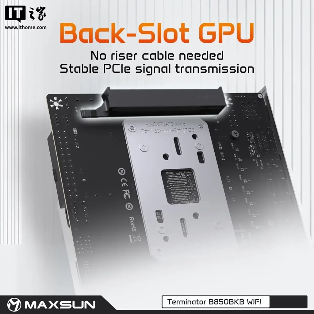 Mit dem Terminator B850 BKB bringt Maxsun ein innovatives Mini-ITX-Mainboard für AMD Ryzen 7000-, 8000- und 9000-Prozessoren auf den Markt. Das Besondere: Der PCIe 5.0 ×16-Slot sitzt auf der Rückseite der Platine, wodurch Grafikkarten vertikal und ohne Riserkabel montiert werden können – ideal für kompakte Builds mit besserem Airflow und sauberem Kabelmanagement.