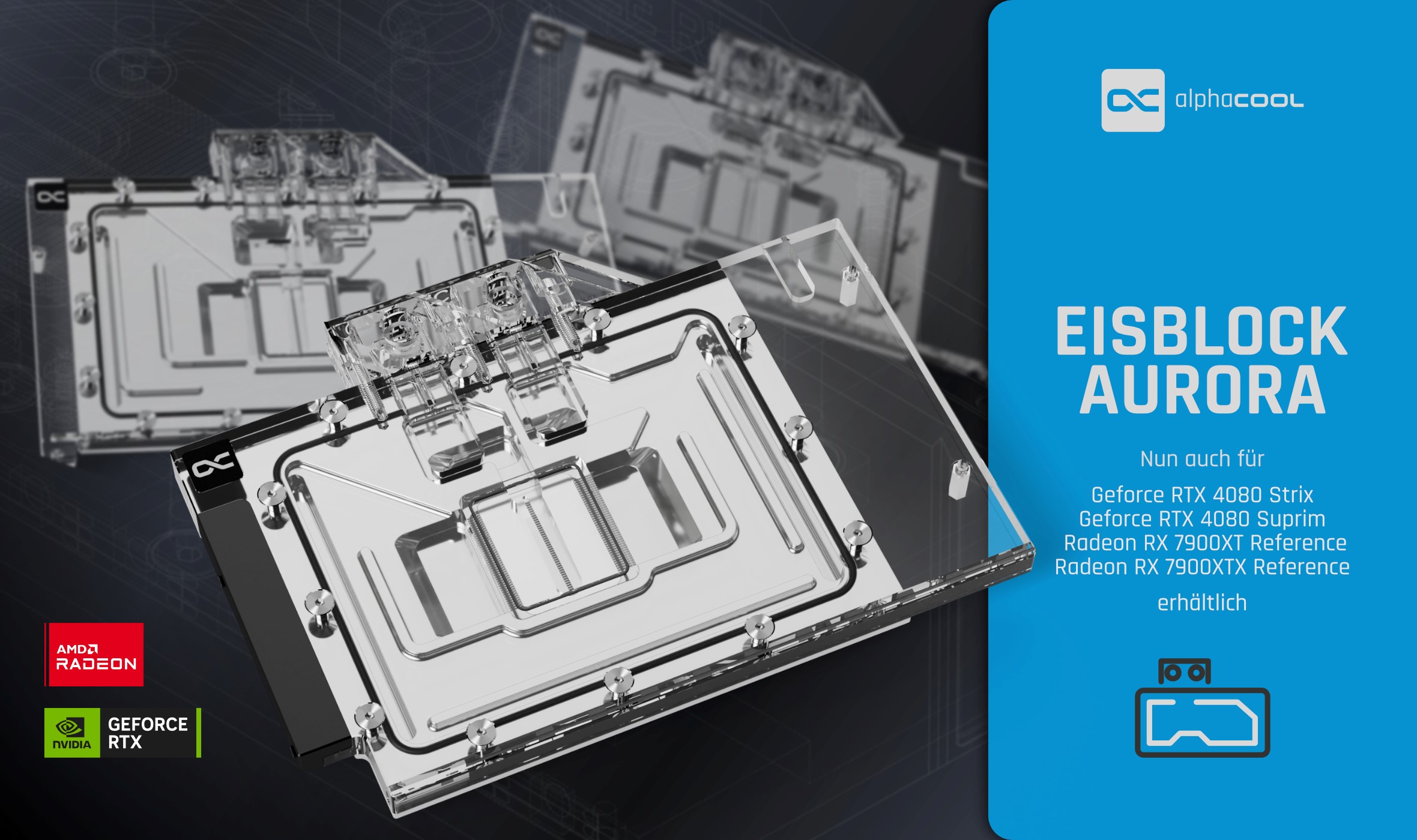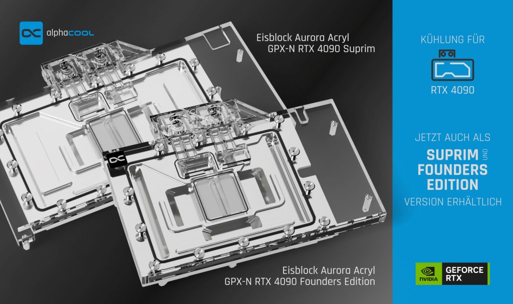 Die Eisblock Aurora Wasserkühler für Nvidia’s Geforce RTX 4090 Founders Edition und MSI Suprim GPU’s sind ab sofort im Alphacool Online Shop vorbestellbar.