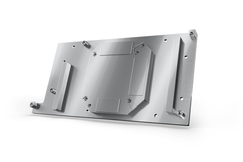 Der Eisblock Kühler wurde nicht nur technisch verbessert: Das Aurora Design der Radeon RX 7XXX Eisblock Generation ist optisch ruhig und schlicht, weil nur ein O-Ring den gesamten Kühler umläuft. Außerdem sorgt die Konstruktion rund um die Kühlfinnen und der Jetplate für eine klarere Optik. Die Beleuchtung der digital adressierbaren RGB-LEDs entfesselt dank der Verchromung ein schönes Farbspiel im lichtdurchfluteten Kühler.