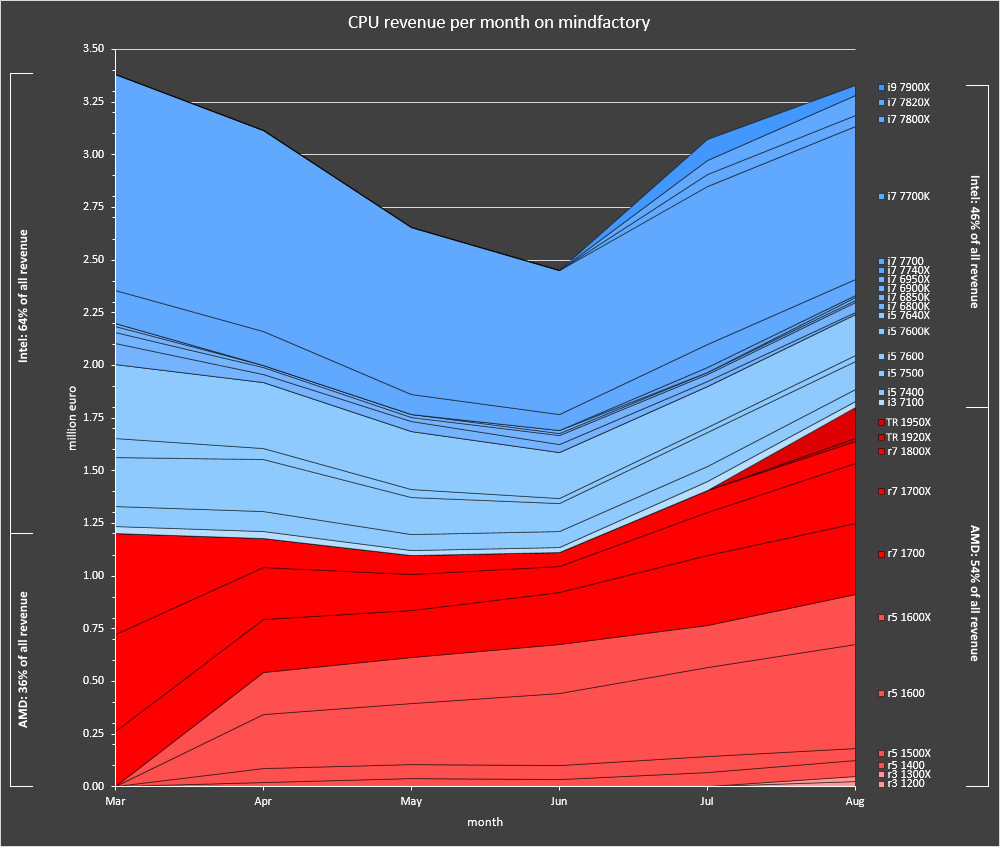 Mit den aktuellen Zahlen präsentiert Mindfactory die Verkaufsstatistik der letzten Monate, um uns einen Überblick zu liefern. Deutsche und europäische DIY PC Bauer haben mittlerweile vermehrt zu AMD gegriffen. Das zeigt sich sehr gut in der Verkaufsliste von Mindfactory. Seit März, mit dem Release des Ryzen 7, stiegen die Verkaufszahlen von AMD stark an. Genau genommen, von 28 % im März (vs. Intel 72 %) auf 56 % im August. Wir warten aber noch auf den Release der 8. Gen. von Intel im dritten Quartal dieses Jahres. Das könnte die Statistik wieder verschieben.