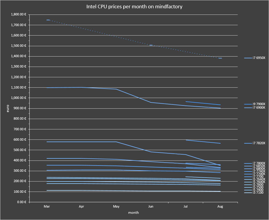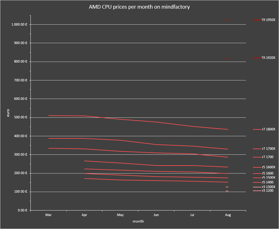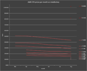 In diesen Statistiken seht ihr in Blau die Preise von Intel und in Rot die Preise von AMD der letzten Monate.