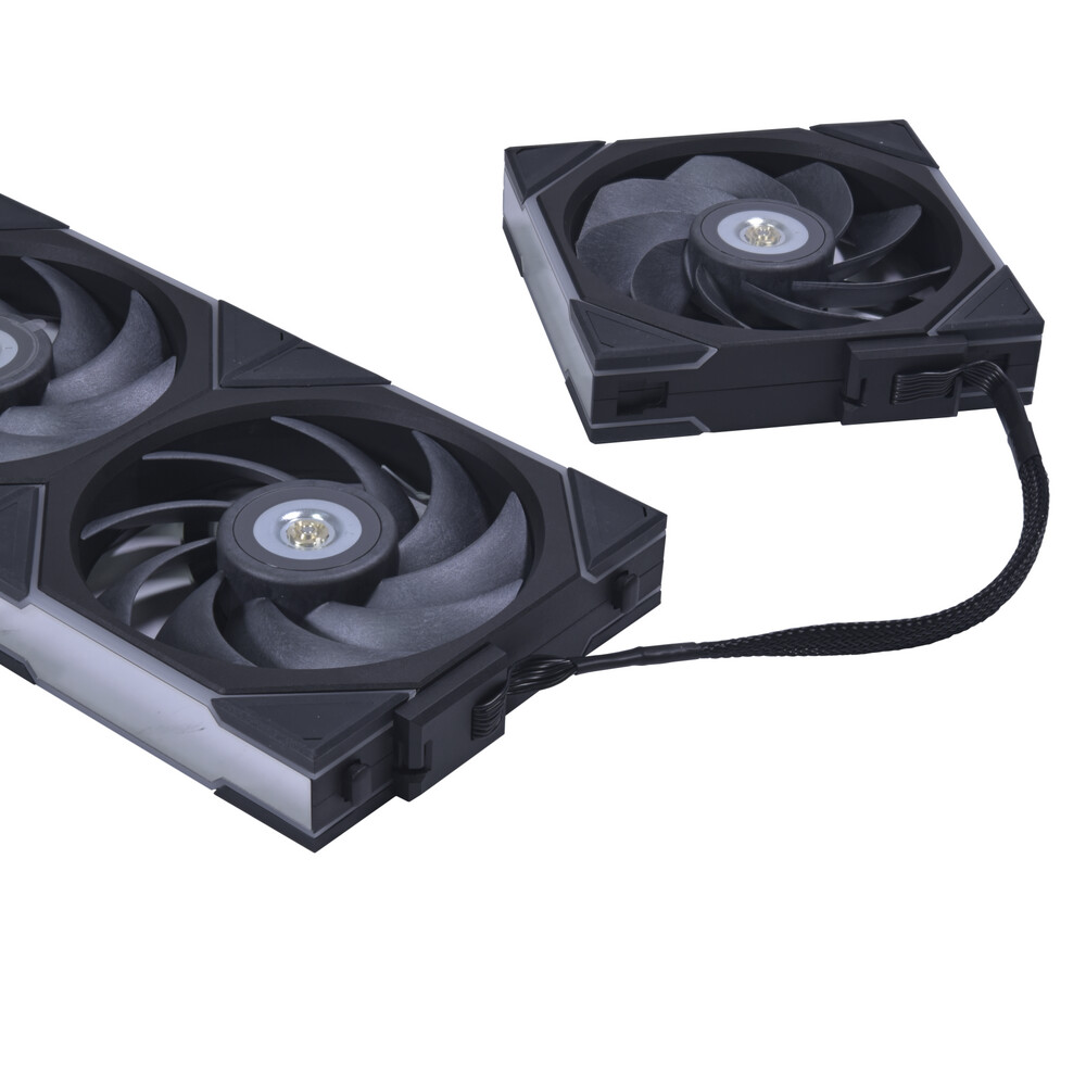 UNI FAN TL und TL LCD besitzen große Infinity-Spiegeln an beiden Rahmenseiten und werden von einer diffundierenden RGB-Leiste längs den Rändern der vibrationsdämpfenden Auflager flankiert. Dieser Beleuchtungsstil erzeugt einen nahtlosen Effekt in verbundenen Clustern. Die LEDs oben und unten sind in zwei Zonen unterteilt, die sich einzeln über L-Connect steuern lassen. Durch Nutzung des ineinandergreifenden Mechanismus der originalen UNI FAN-Einheiten können Nutzer Lüfter-Cluster bilden, die über ein einzelnes Kabel (beim UNI FAN TL lassen sich bis zu 10 Lüfter mit einem einzelnen Anschluss verbinden) mit Strom versorgt werden. Da jeder einzelne Lüfter mit einem eigenen IC ausgestattet ist, erkennt und verwaltet L-Connect automatisch jeden einzelnen Lüfter, sodass die Luftströmung im System optimiert und gleichzeitig die Größe und der Standort der Lüfter innerhalb jeder einzelnen Gruppe auf intelligente Weise ausgewiesen wird.